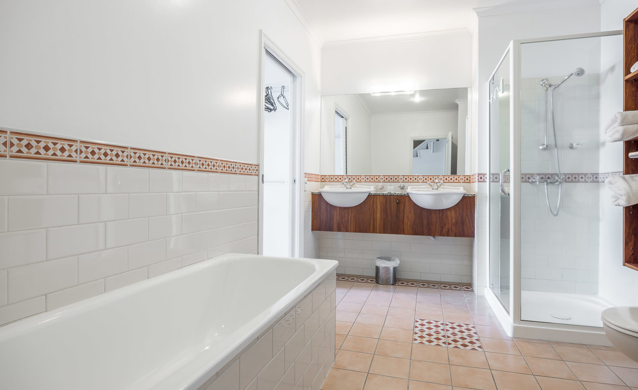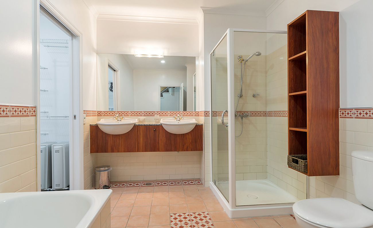 Modern Bathrooms: Large bathroom with shower, bath, and laundry; main bedroom upstairs with ensuite.