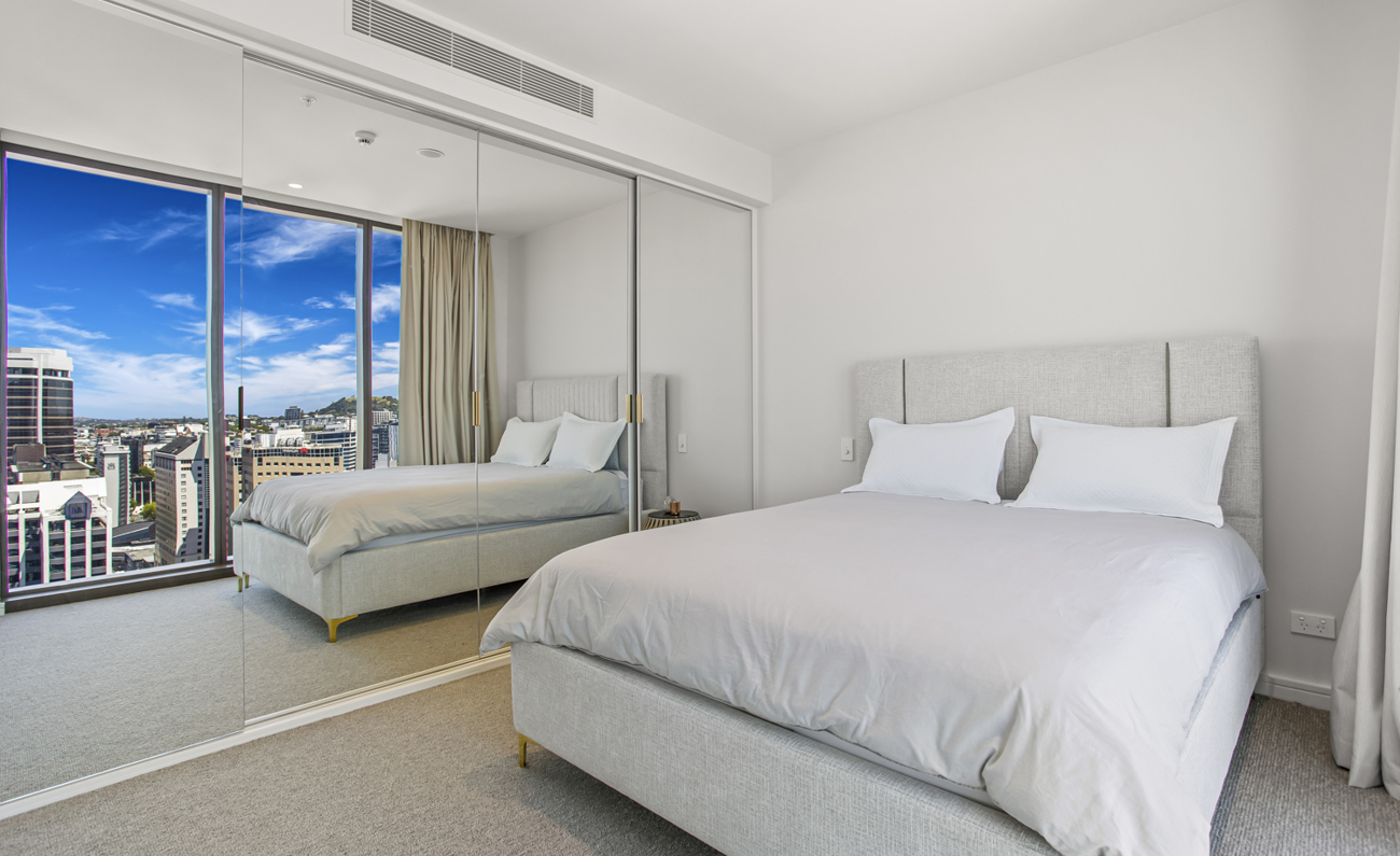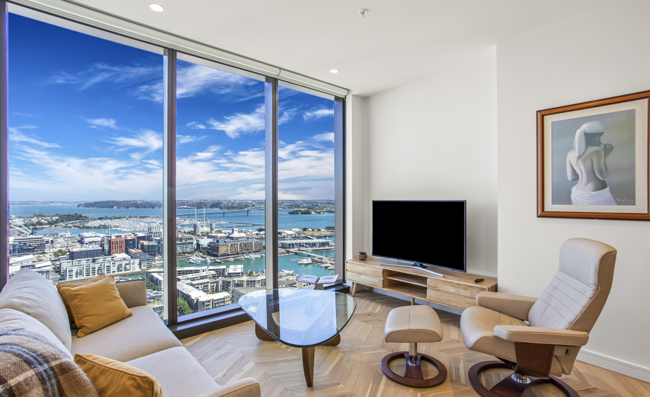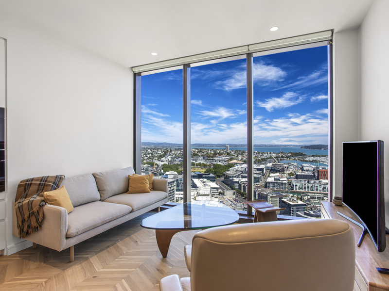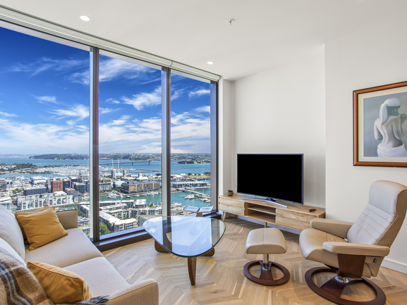 Expansive Bedrooms: Two spacious bedrooms with breathtaking panoramic views of Auckland's skyline and the sparkling ocean.