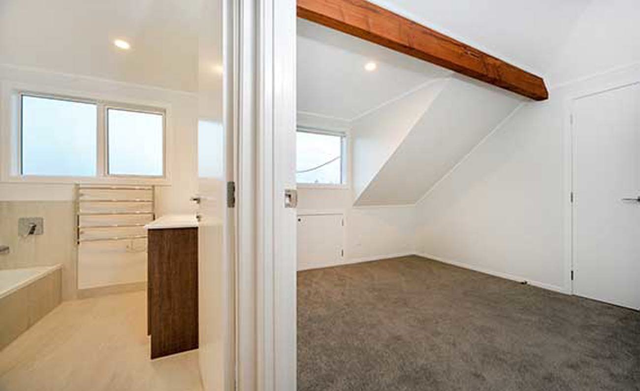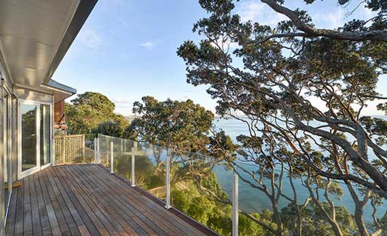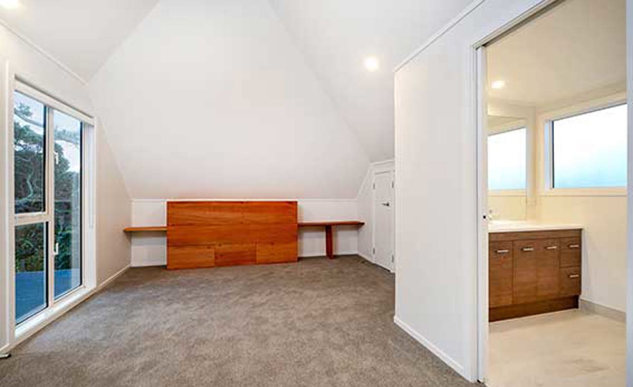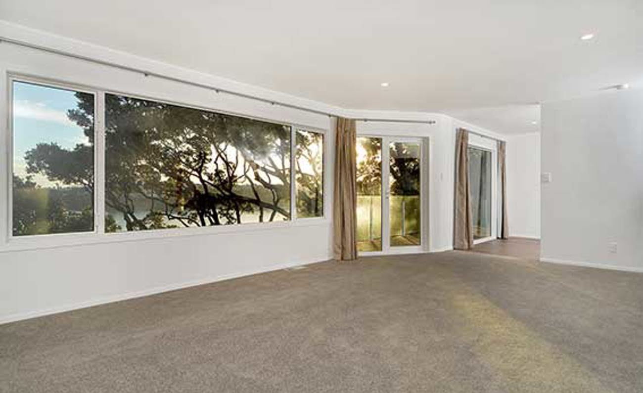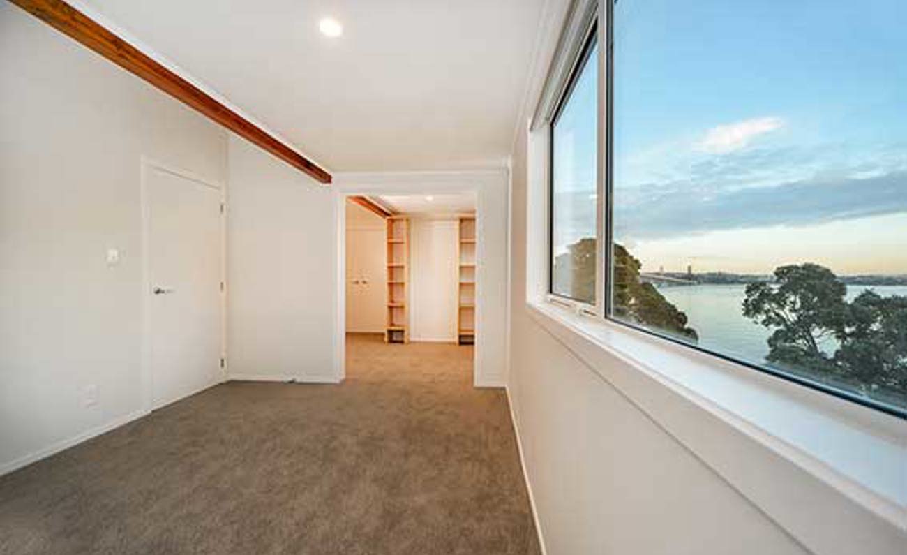 Upstairs are three large bedrooms, all of which have views either to the east or west, plus there are two bathrooms and a study/dressing room in one of the bedrooms. The fourth bedroom and a large rumpus are on the lower level, together with a third bathroom. A large west-facing covered deck on this level, too, with views over the bay to Birkenhead Point.