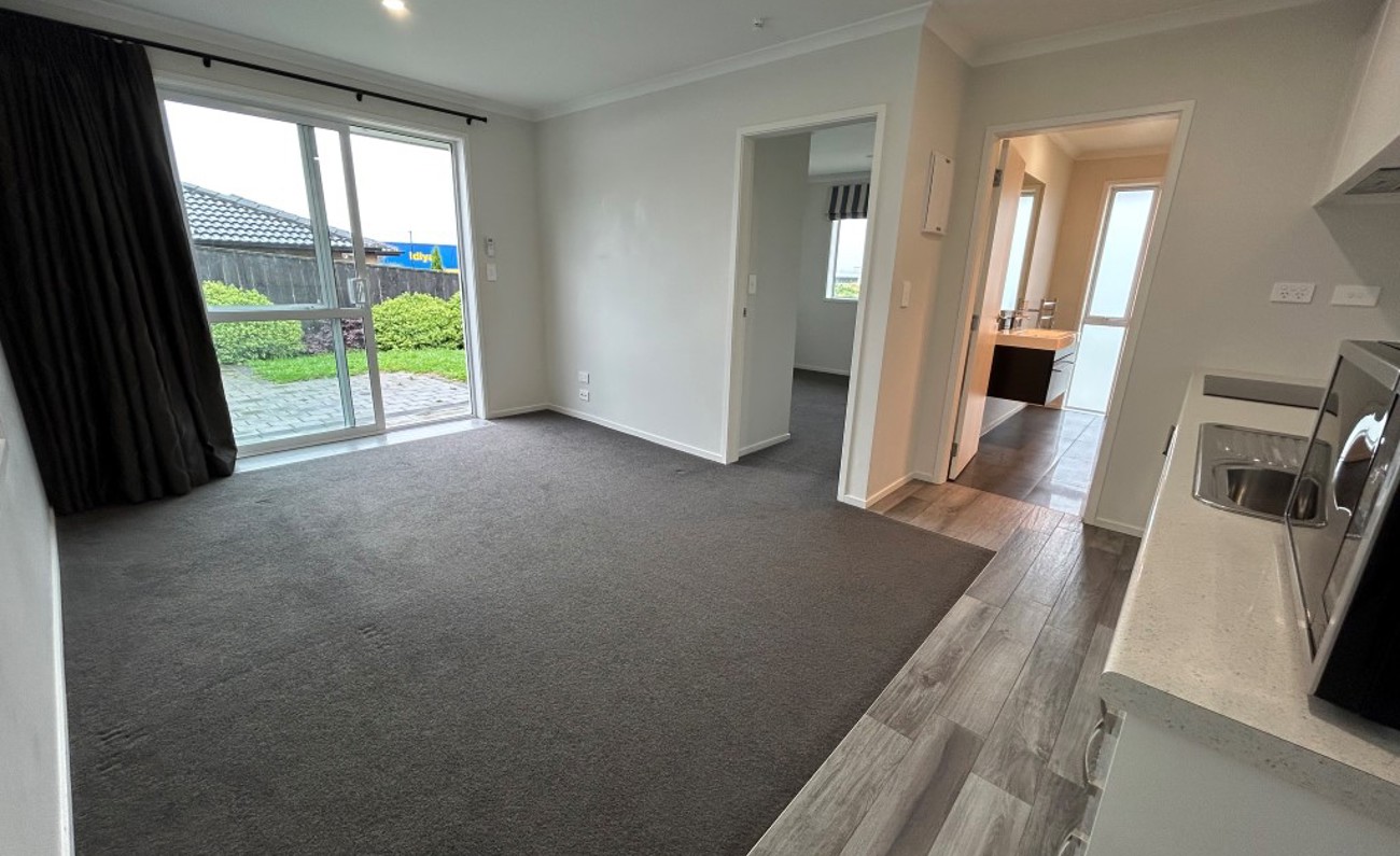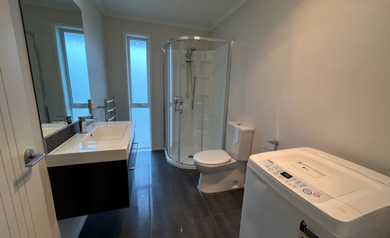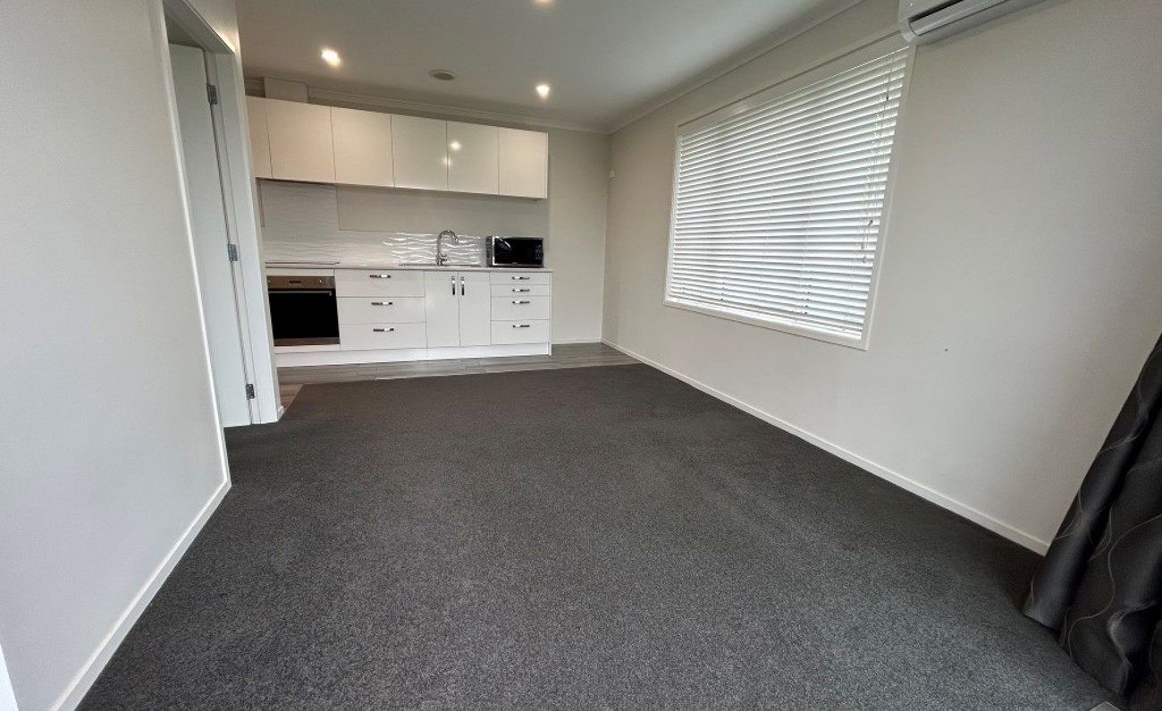 Neat and tidy one-bedroom unit with its own private entrance, attached to an owner-occupied home. The unit features an open-plan kitchen, dining and living area, a double bedroom, and a separate bathroom with laundry alcove.