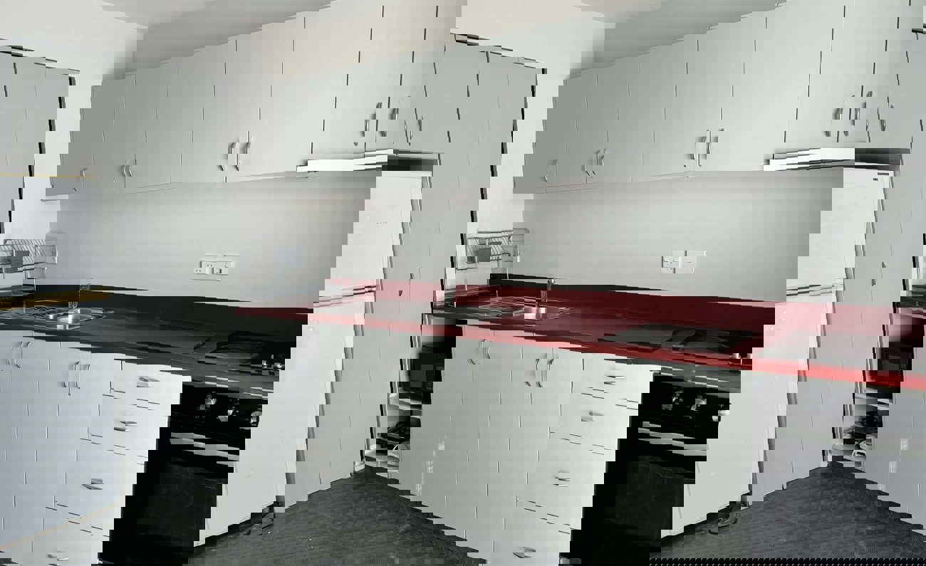 There is a modern kitchen with a dining table and a spacious lounge.