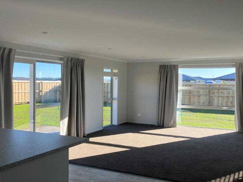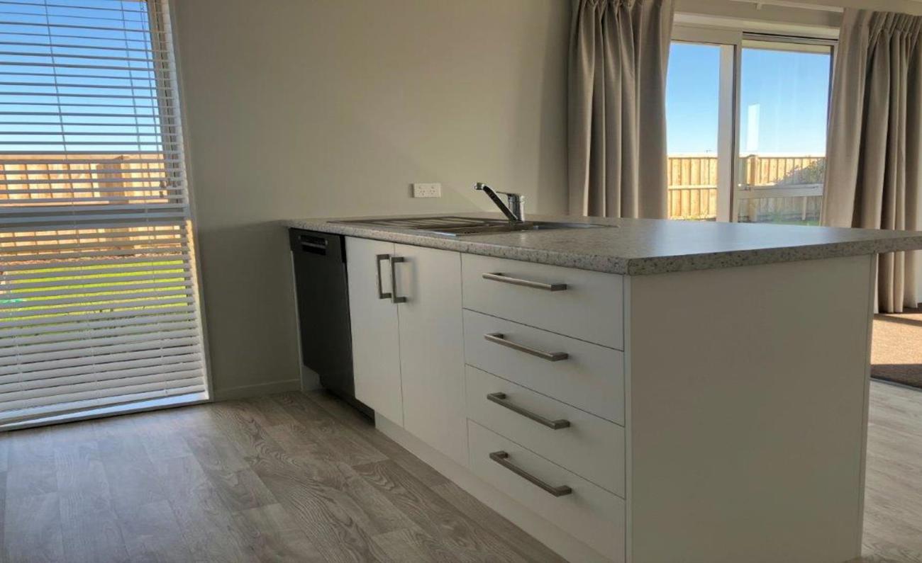 * A modern kitchen with a dishwasher and a central island making it open plan to the sunny living and dining areas.
