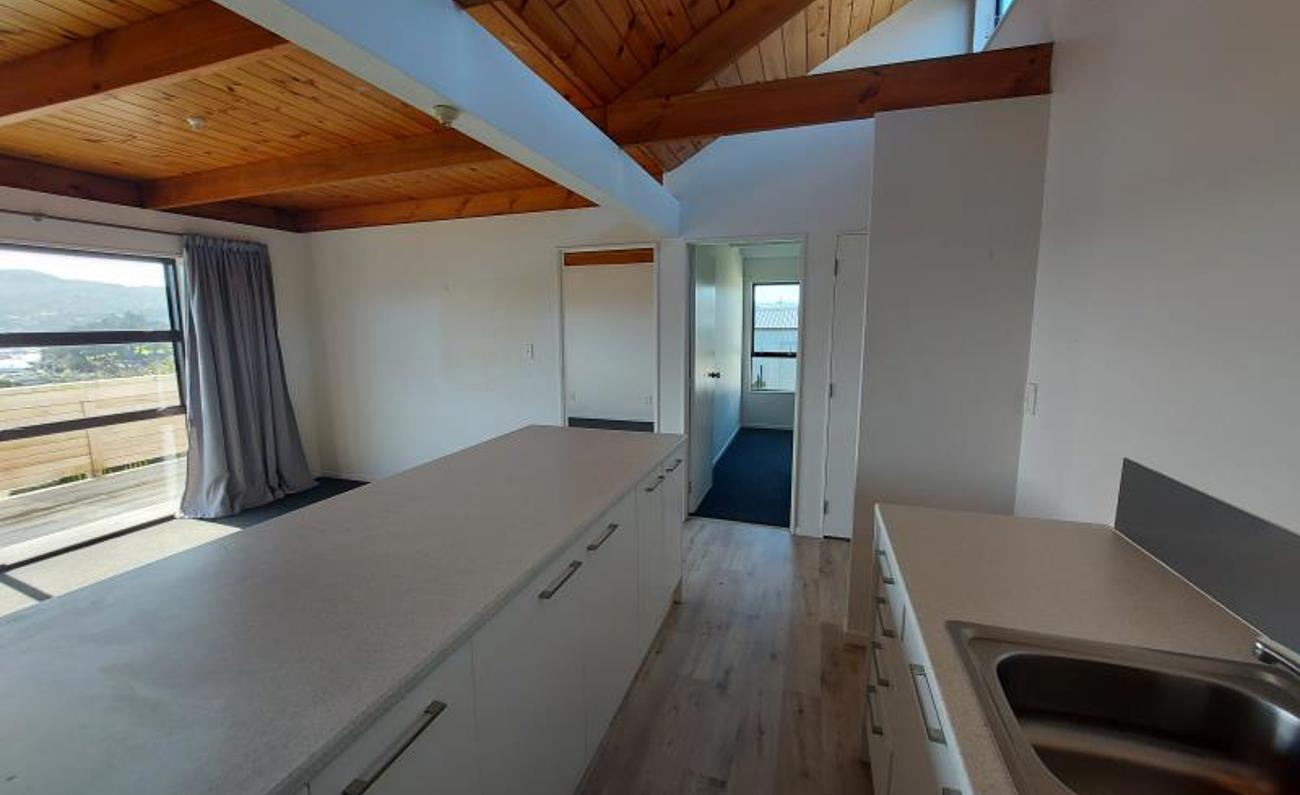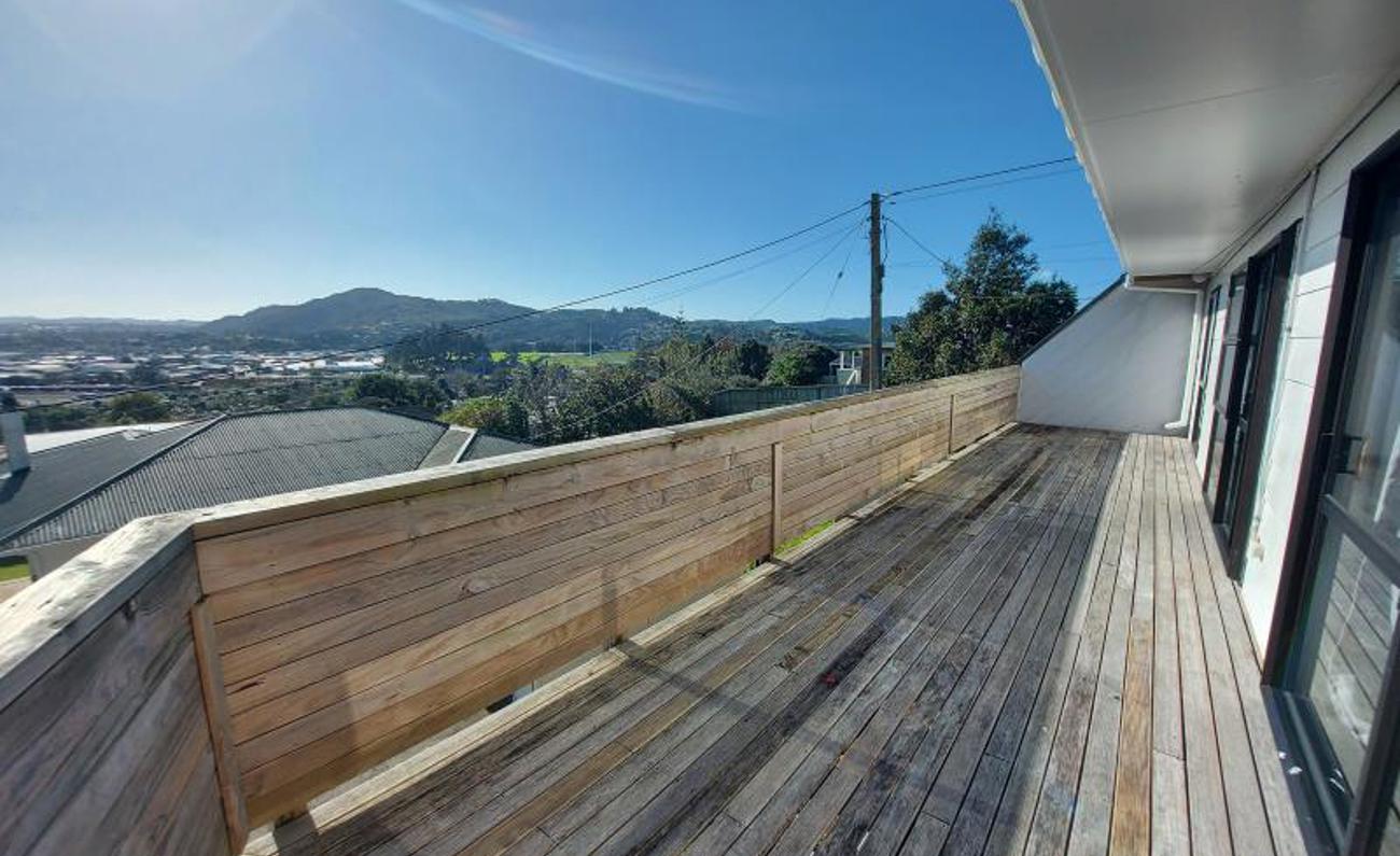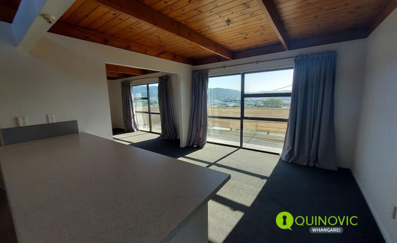 This home is like an apartment. There is an expansive deck with 180 degree views over central Whangarei. The open plan living and kitchen area have lots of windows to make the most of the views and the sun. There are two bedrooms on one side and a master bedroom with its own wing with a semi ensuite on the other side. There is one off street car park in the carport. If you are looking for sun, views and a home that feels light and bright and warm then this is the home for you.
