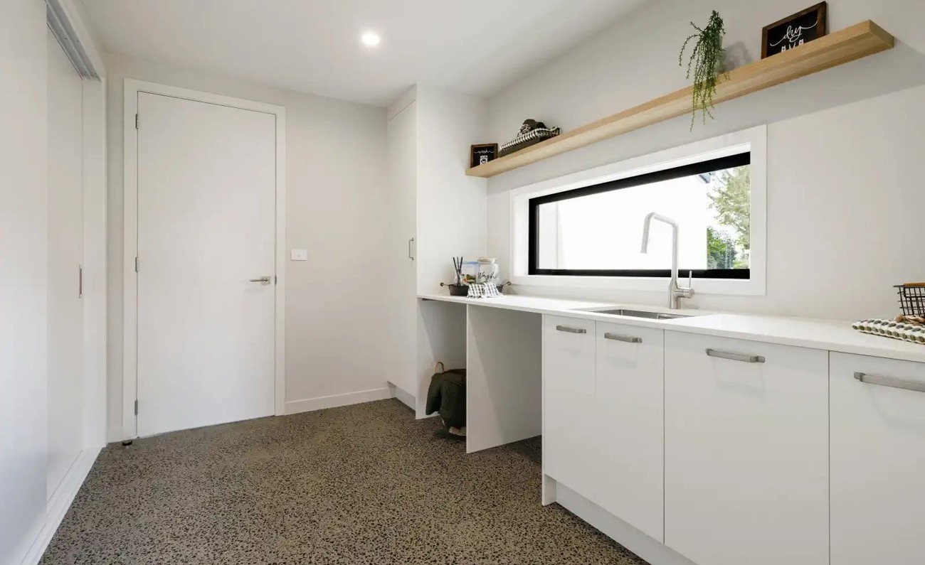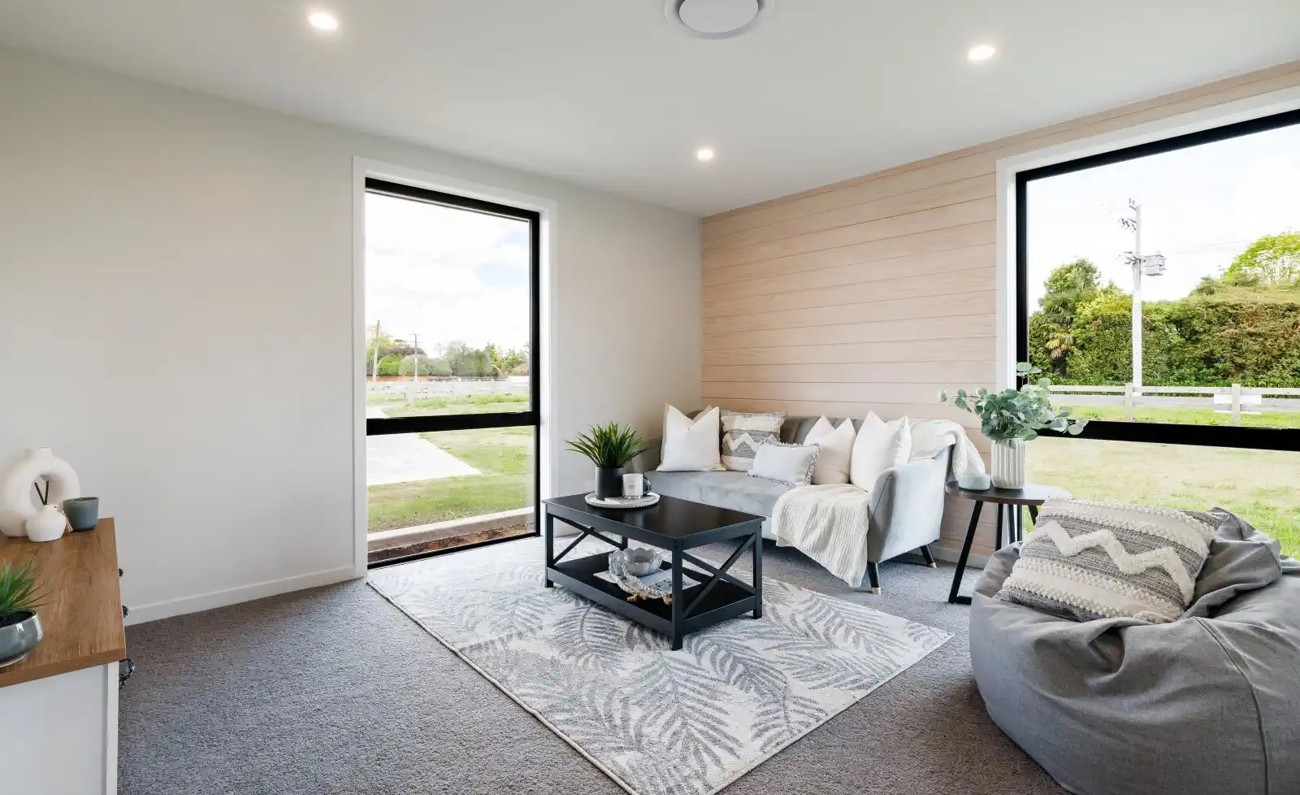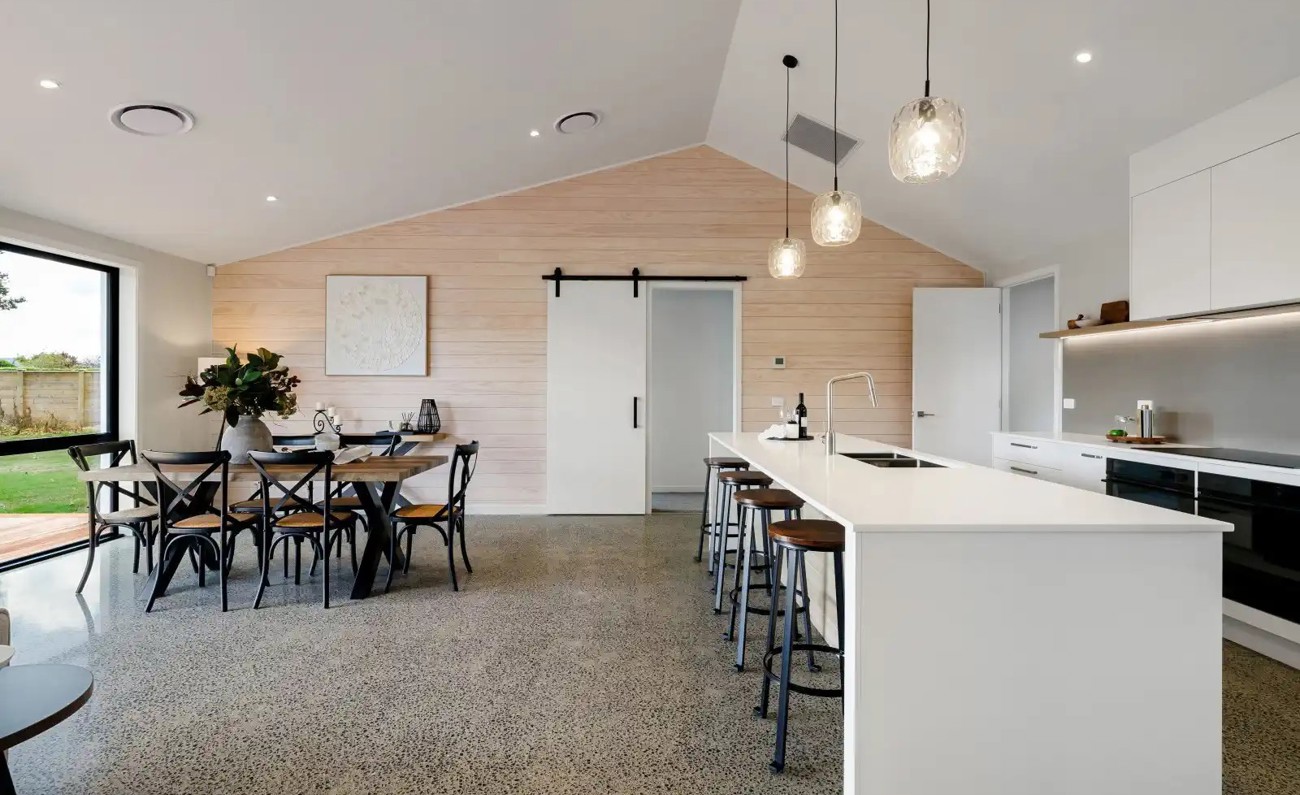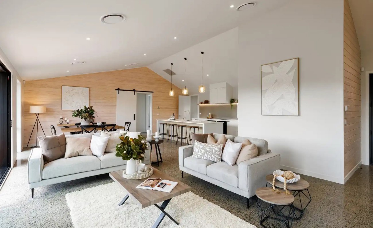 The kitchen is a real highlight — modern and spacious, with an induction cooktop, double ovens, and a large walk-in scullery . The open-plan living area features polished concrete floors, warm timber accent walls, and impressive scissor truss ceilings. There’s also a cleverly placed media room for relaxing.