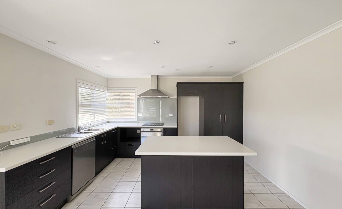 Three bedrooms, with the master bedroom boasting a deluxe ensuite complete with an oversized, fully tiled shower and bath. The heart of the home is a modern kitchen, designed for and functionality. It features a spacious central island with breakfast bar, abundant storage, and generous bench space.