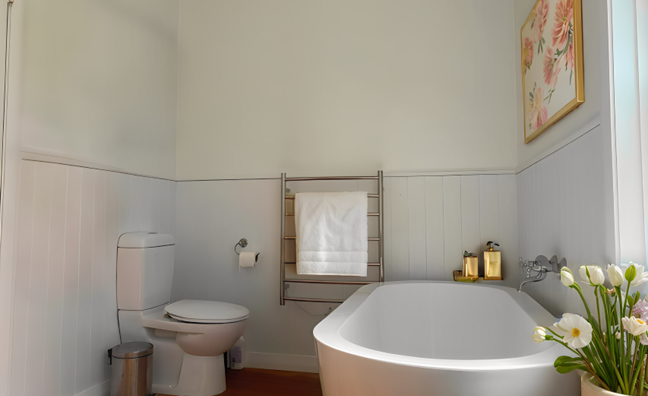 Throughout the home you’ll find neutral tones, new drapes and fittings, Art Deco light pendants, carpeted bedrooms and lounge, and wooden floors in the kitchen and bathrooms—creating a warm, cohesive feel.