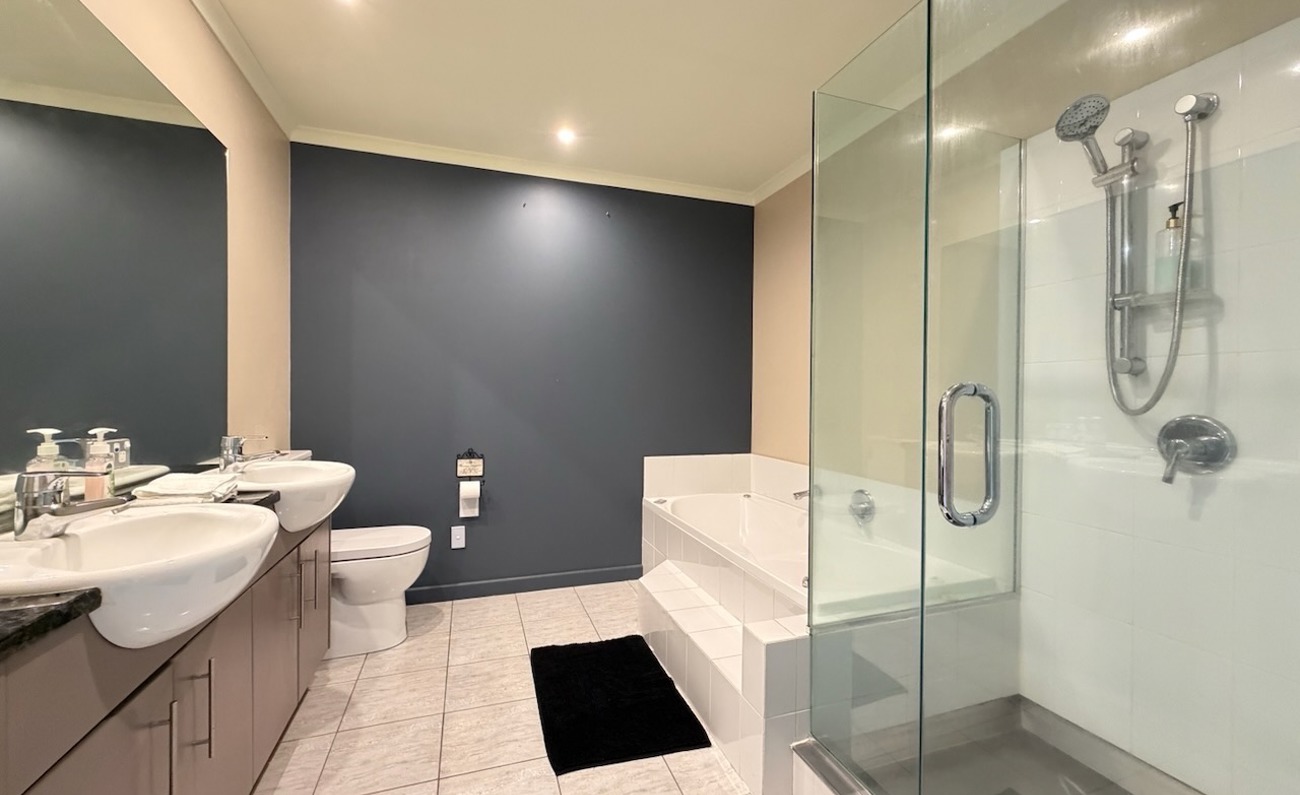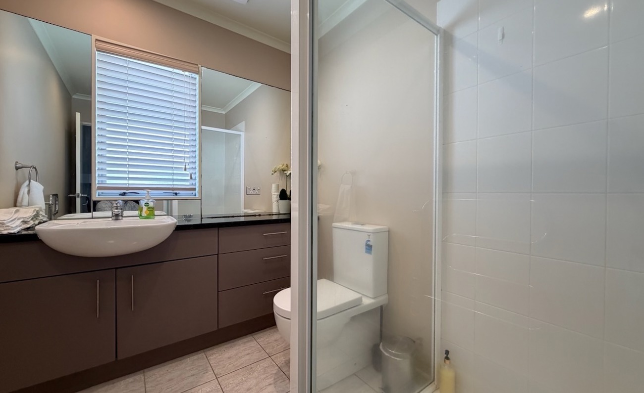 Inside, you’ll find five bedrooms and three full bathrooms, including a luxurious master ensuite with a spa bath and twin shower. All bedrooms feature wardrobes, and three open onto private balconies. There are two living areas, with the upstairs lounge currently converted into the 5th bedroom.
