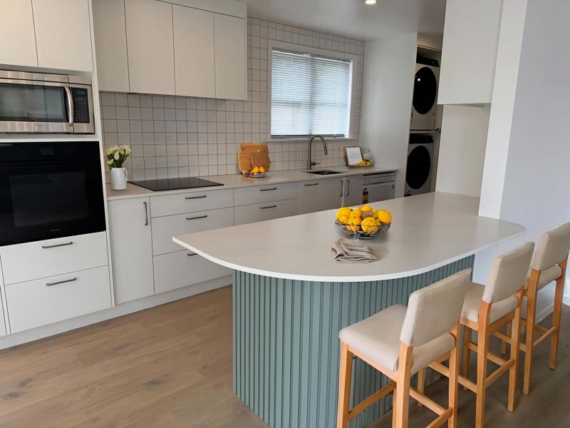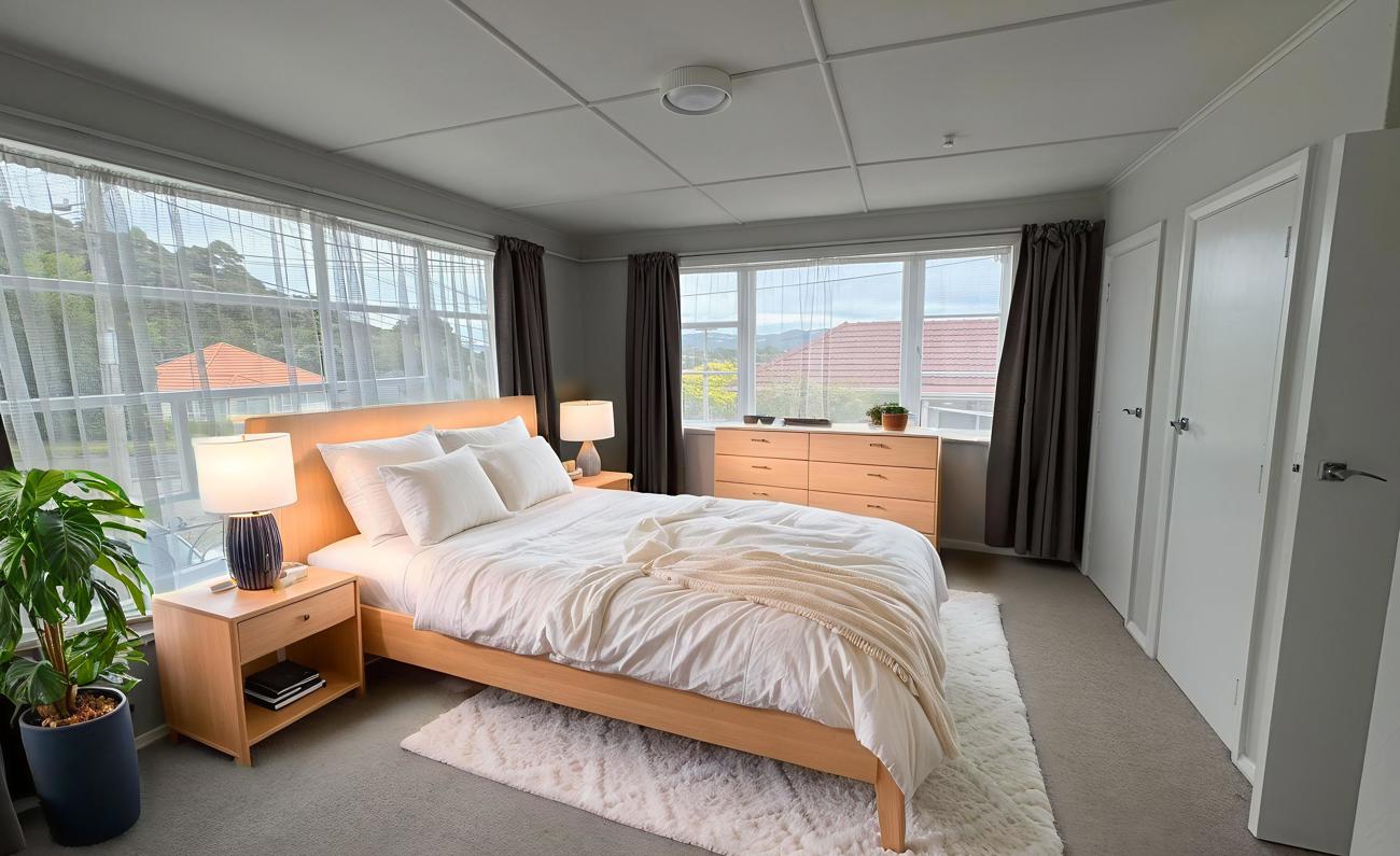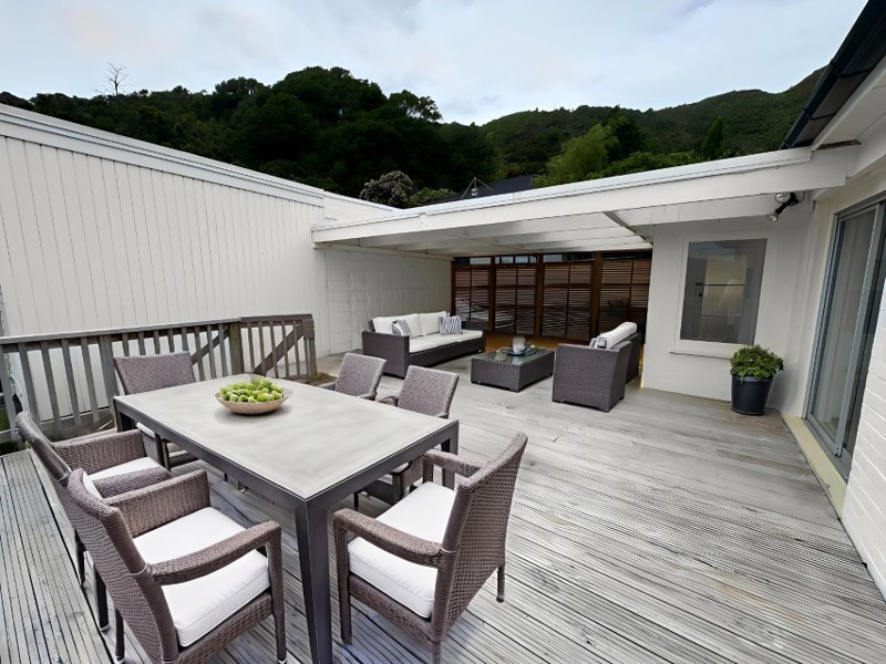 The huge semi-covered deck is the highlight, overlooking the park and hills — perfect for weekend breakfasts, summer barbecues, or evening drinks, rain or shine. Inside, the open-plan kitchen, dining and living area flows seamlessly to the deck, creating a warm, social space for entertaining.