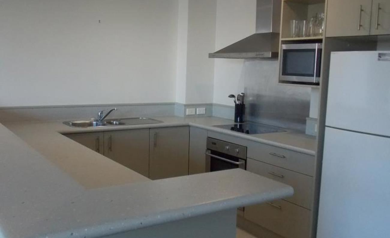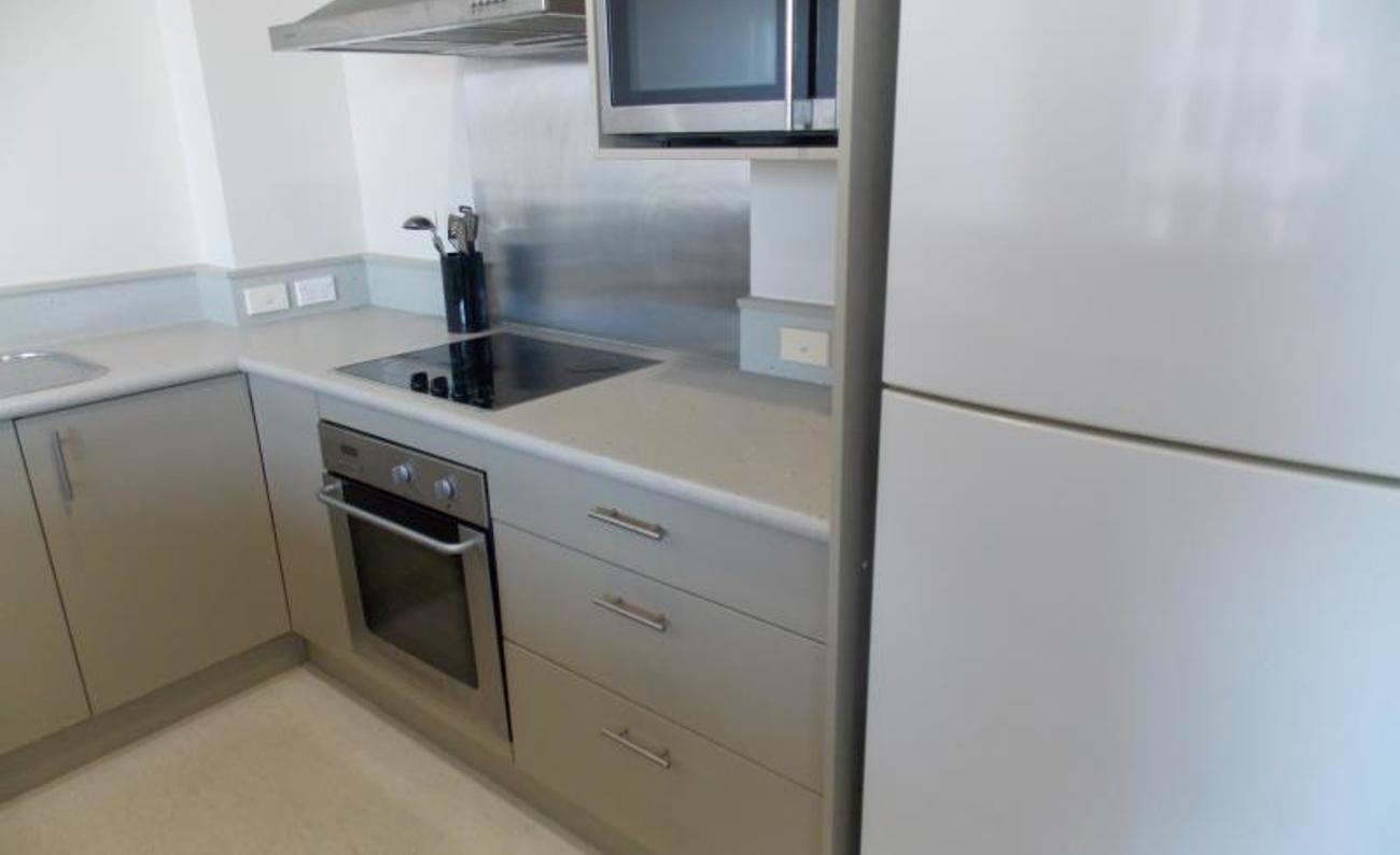 Modern spacious kitchen which open plan to living an dining room. Balcony with great city views.