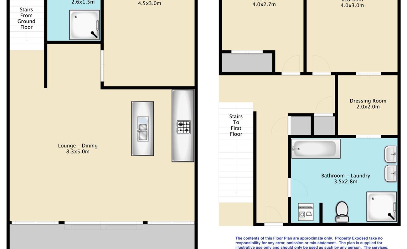 Modern Bathrooms: Large bathroom with shower, bath, and laundry; main bedroom upstairs with ensuite.