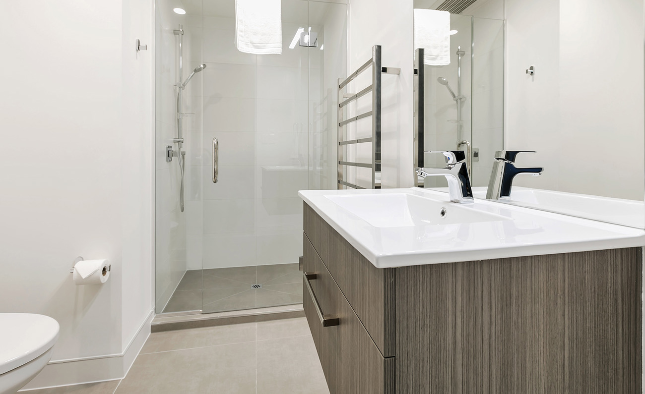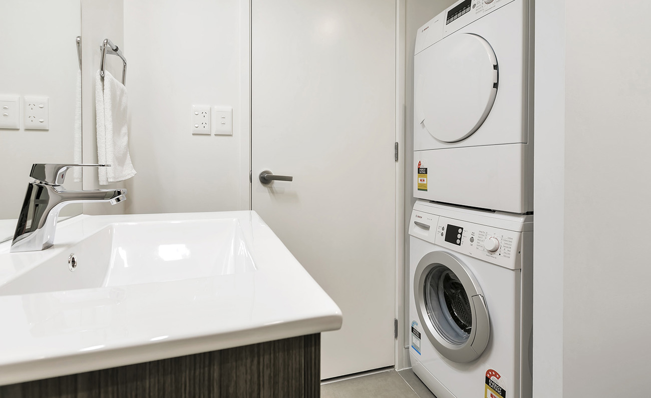 The combined bathroom and laundry is well appointed, featuring a shower, toilet, basin, and a washing machine/dryer.