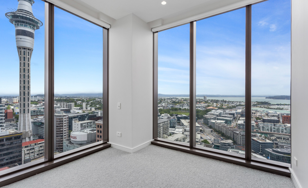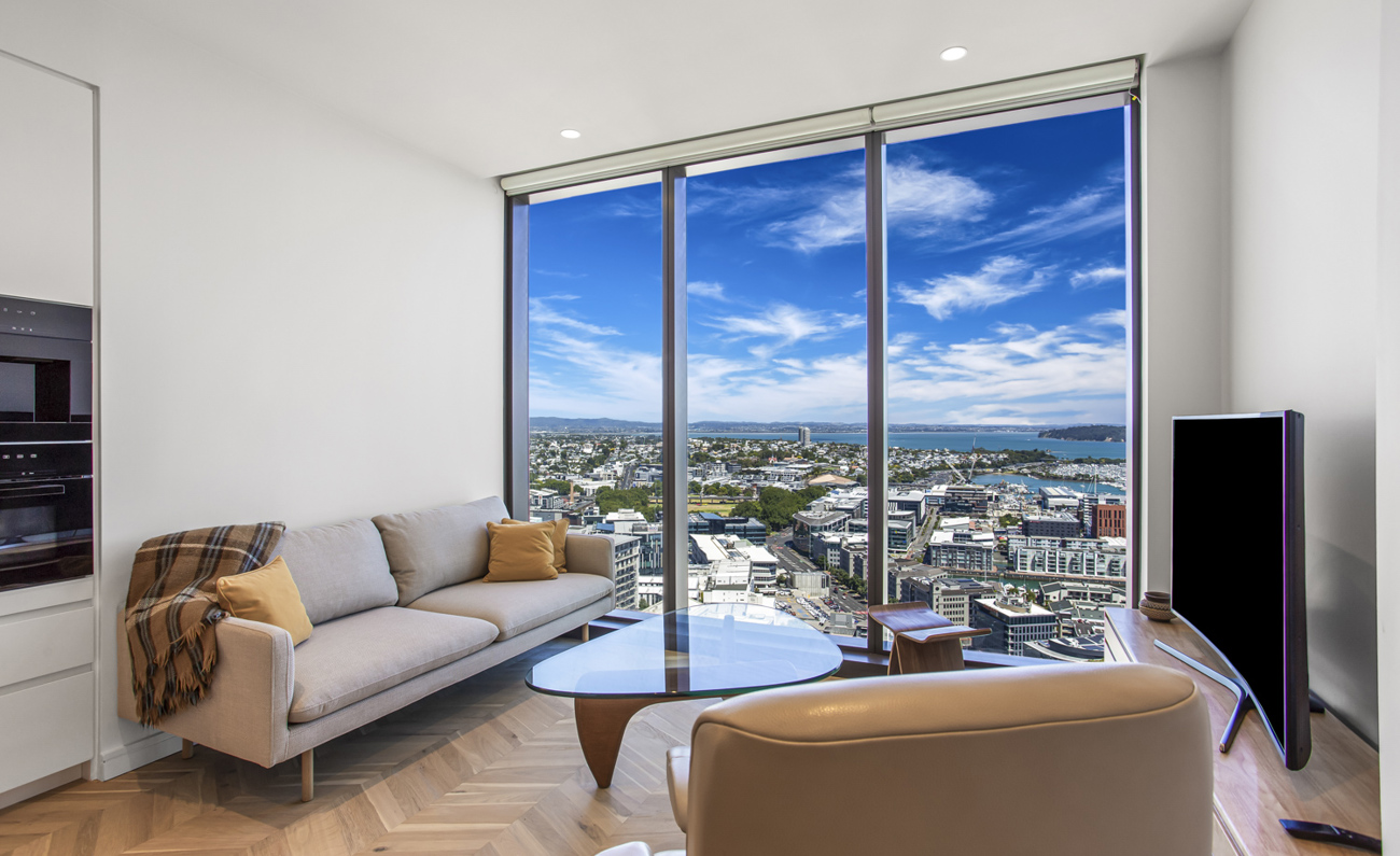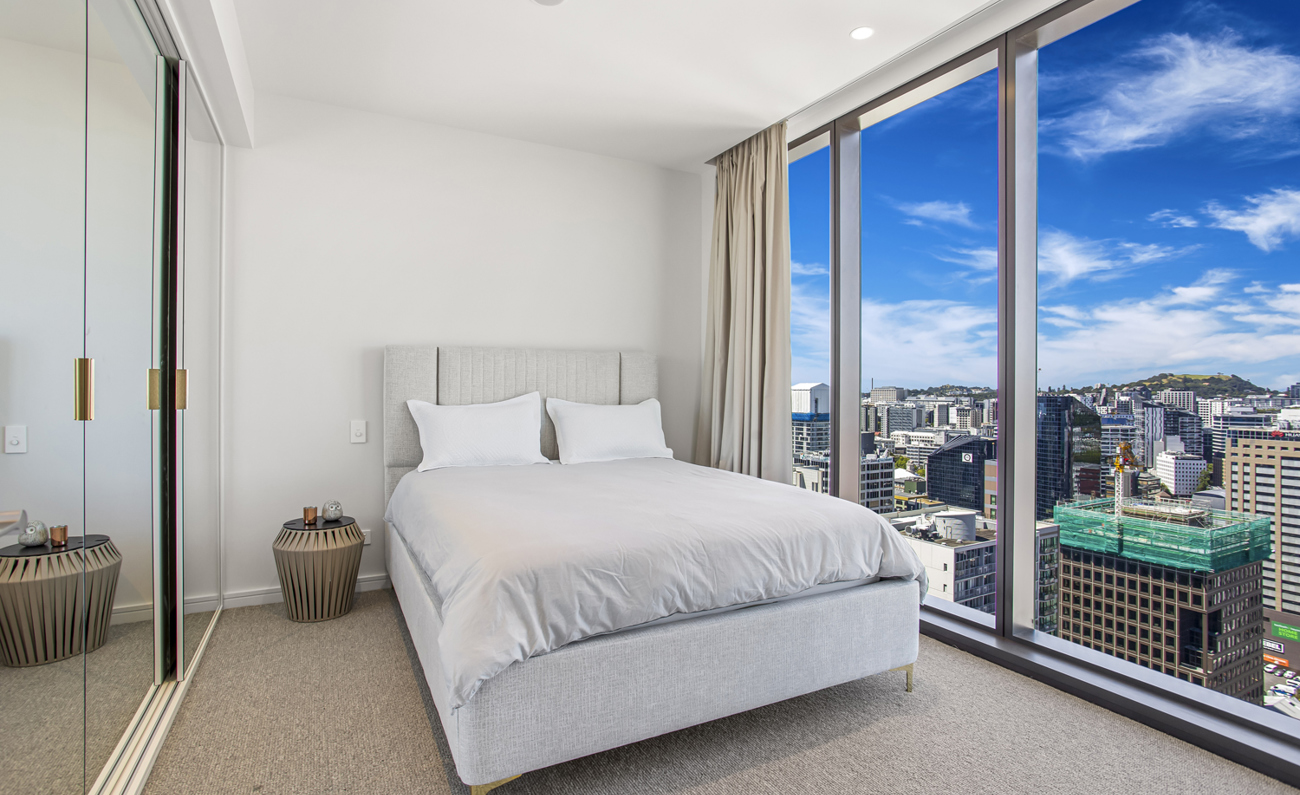Expansive Bedrooms: Two spacious bedrooms with breathtaking panoramic views of Auckland's skyline and the sparkling ocean.