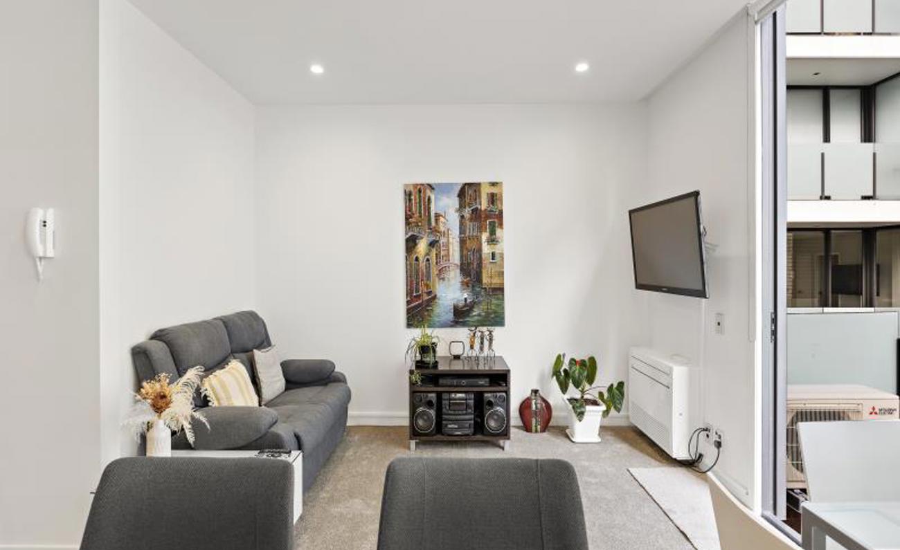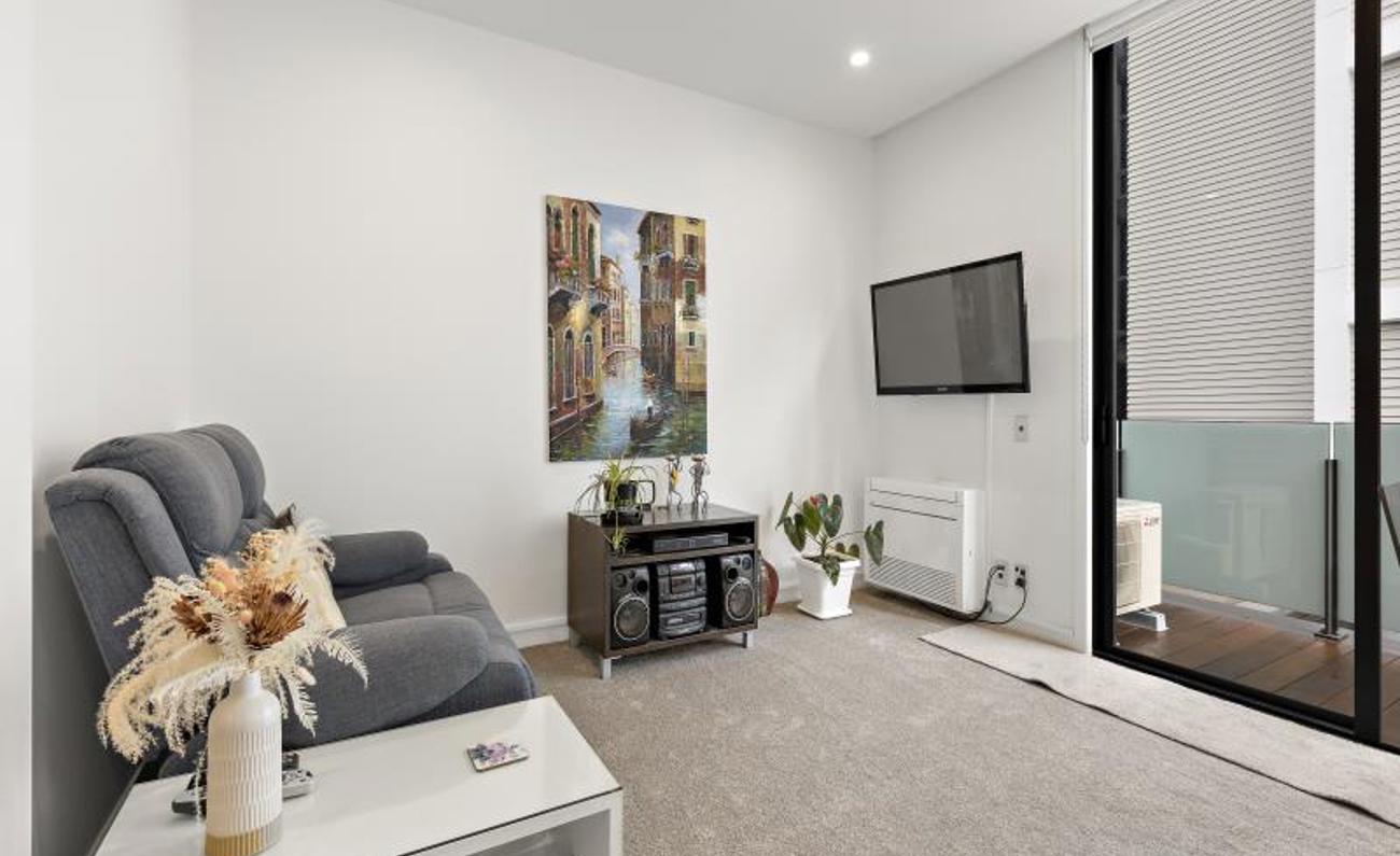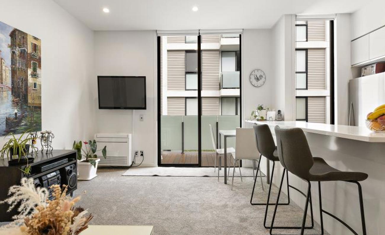 This one-bedroom, one-bathroom, furnished 46SQM plus deck apartment on the second floor has an open-plan living area.