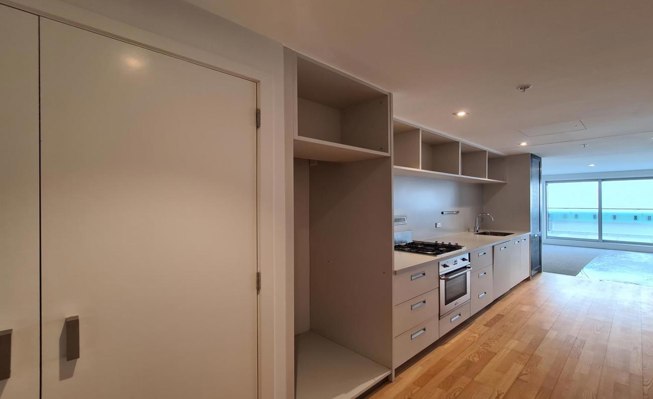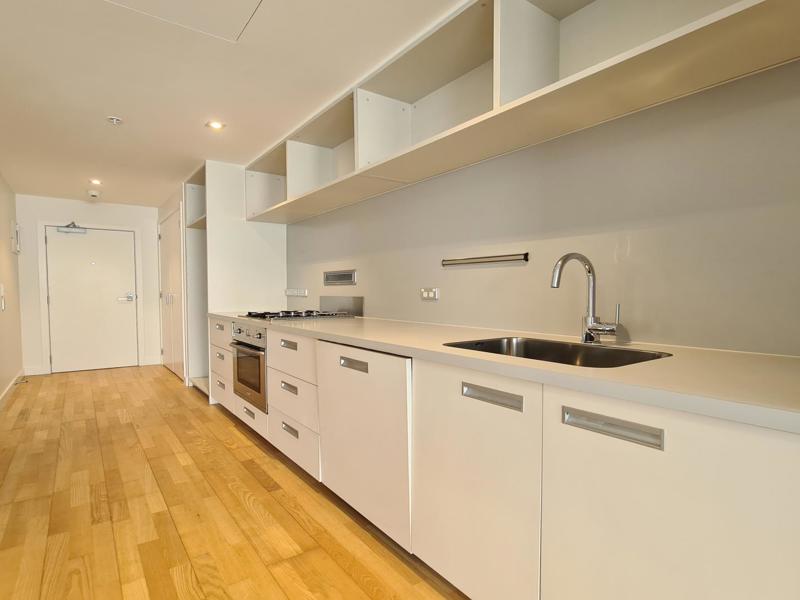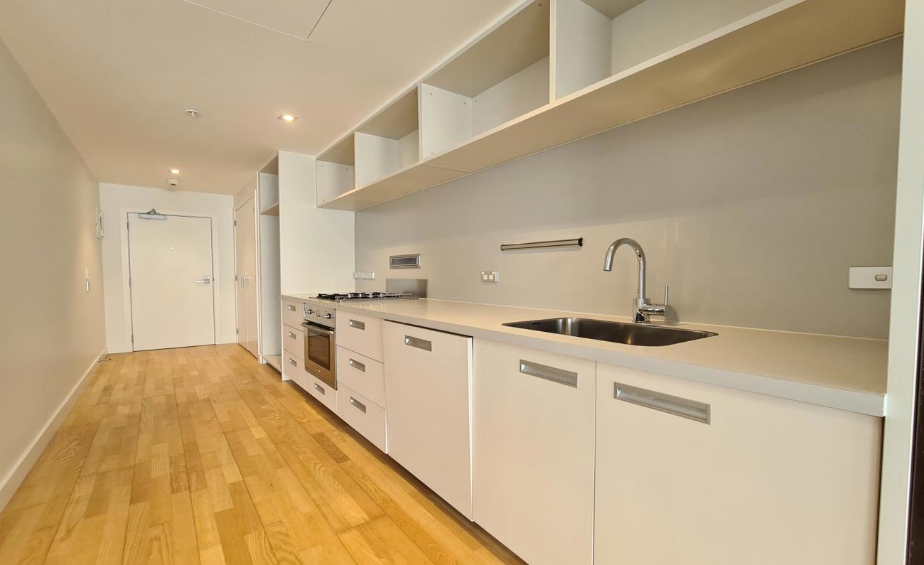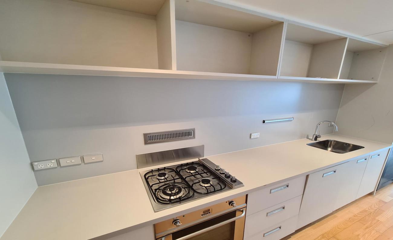 A contemporary galley kitchen offers storage galore, and the liberal bench space is a complete rarity not often seen in apartment blocks with a gas hob.