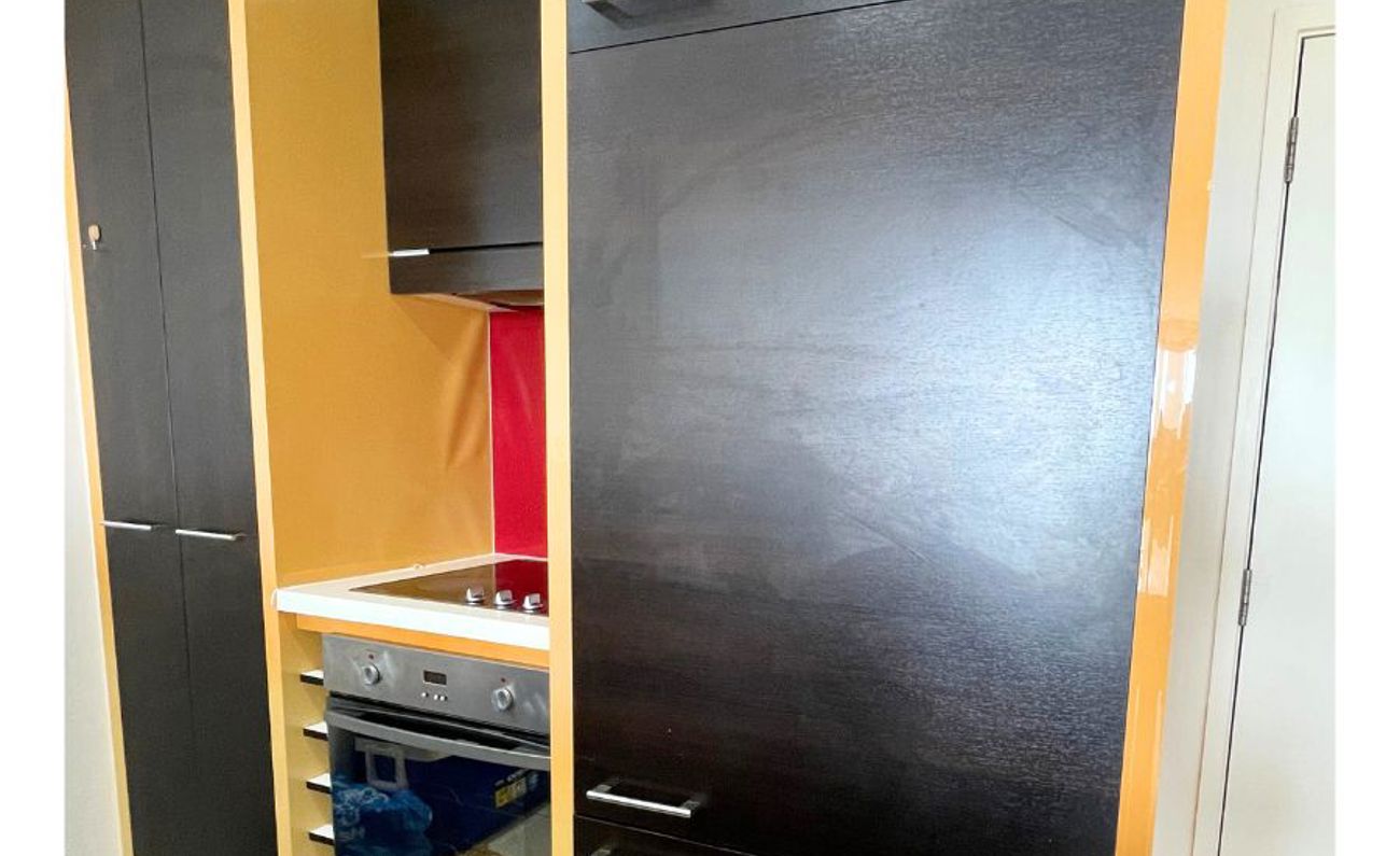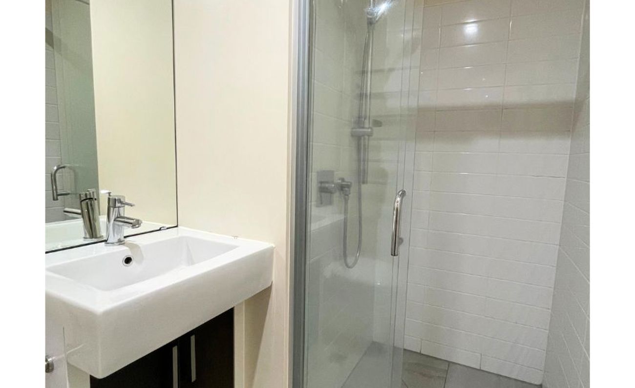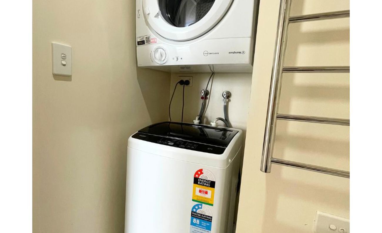 The washing machine and dryer are neatly housed in an alcove within the bathroom, and both bedrooms feature double mirrored wardrobe doors.