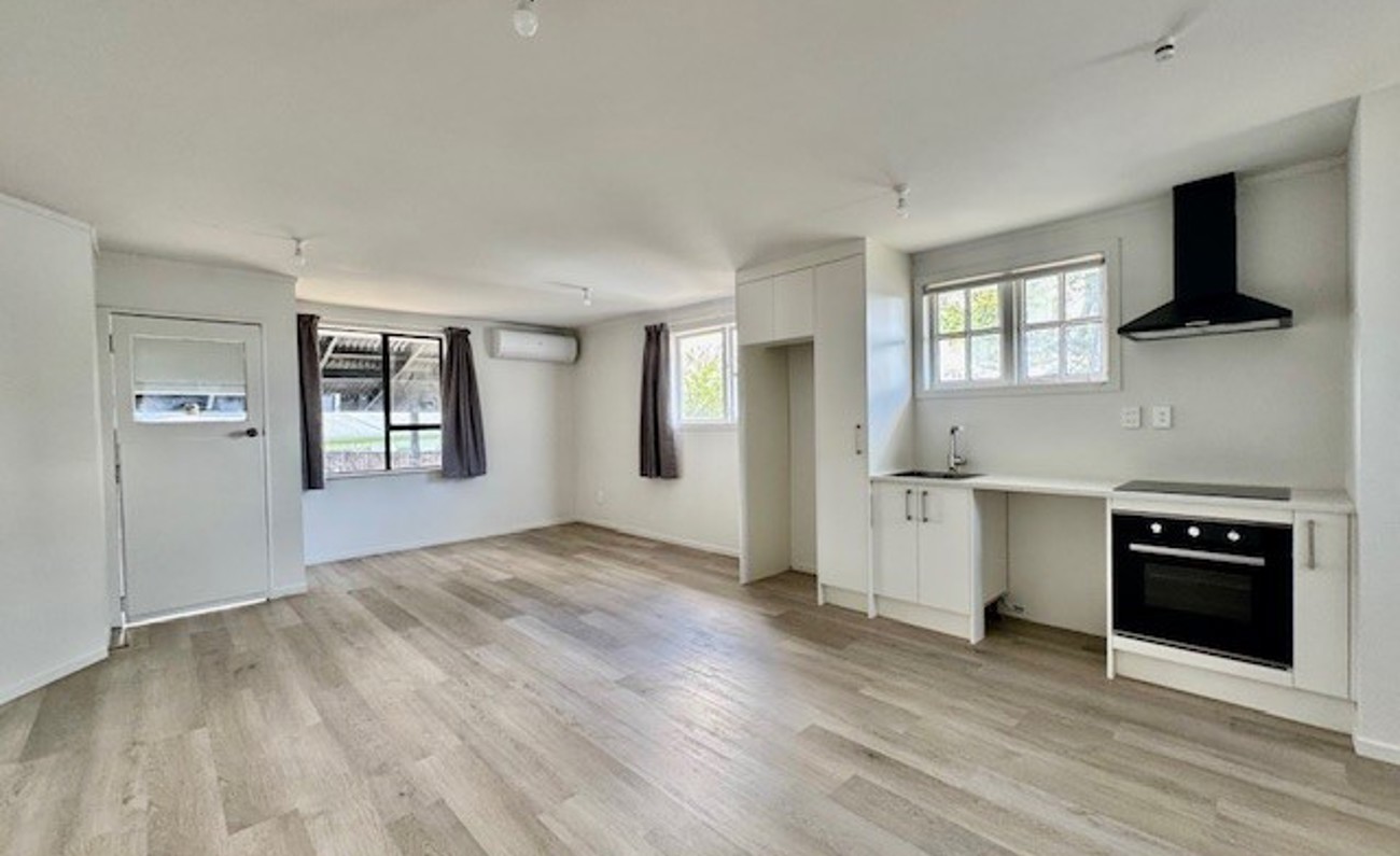 Open-plan living and dining area filled with natural light. Heat pump for year-round comfort. Modern bathroom, separate laundry.