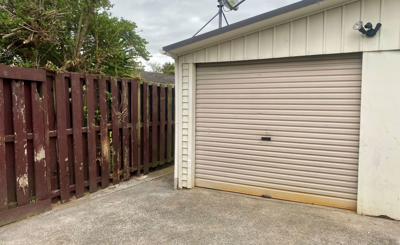 A single garage with additional storage attached to the side provides extra space for tools or household items.