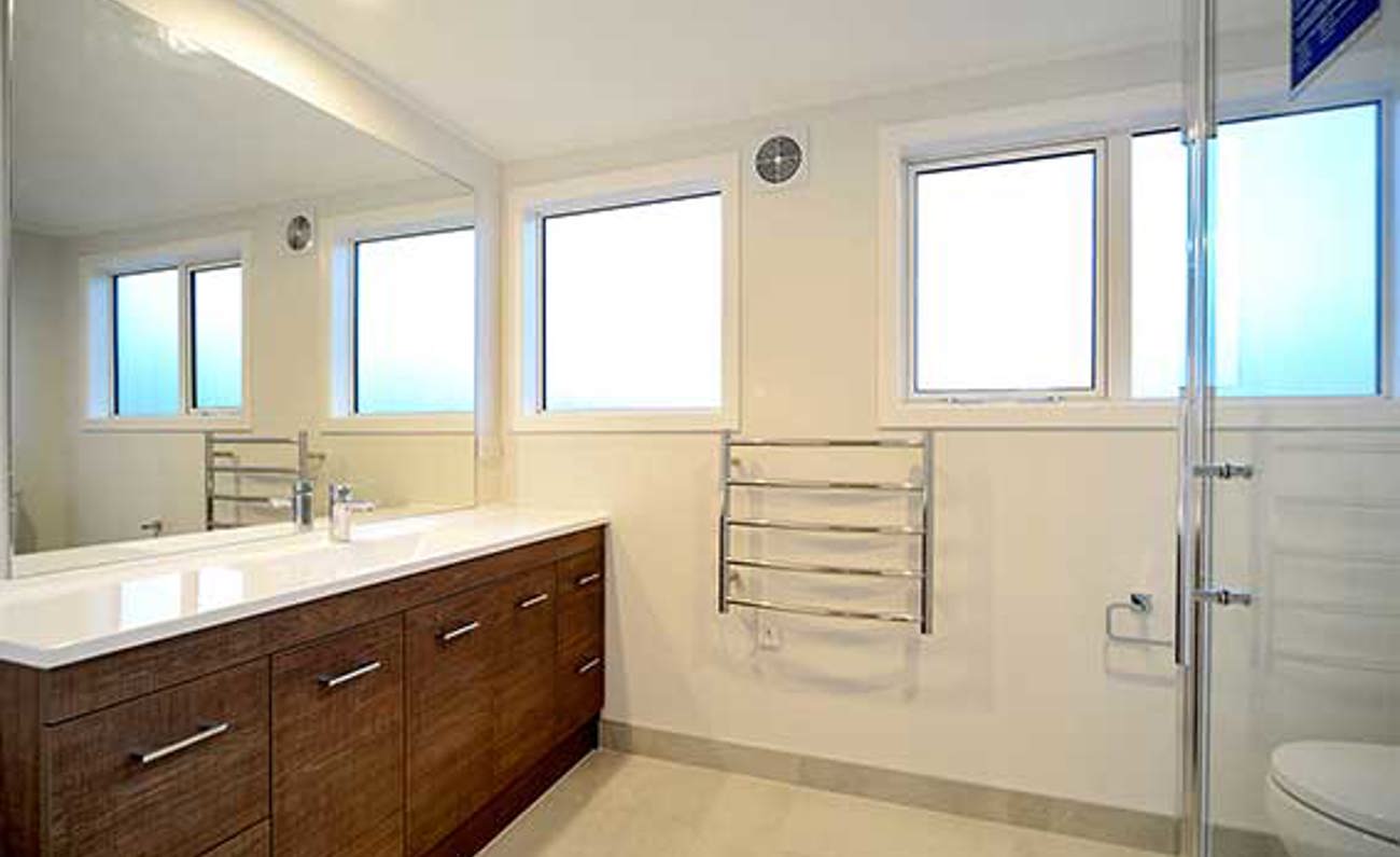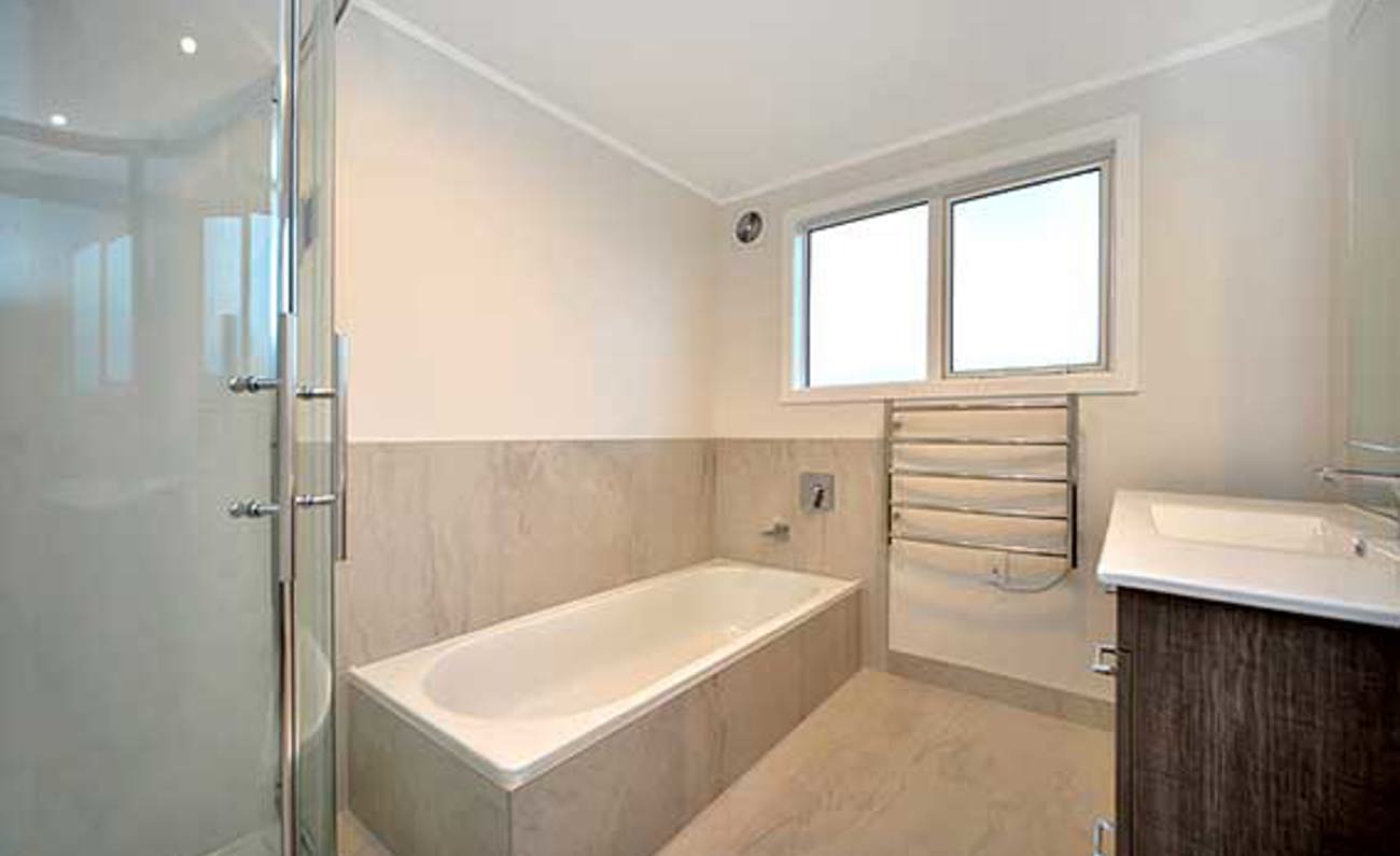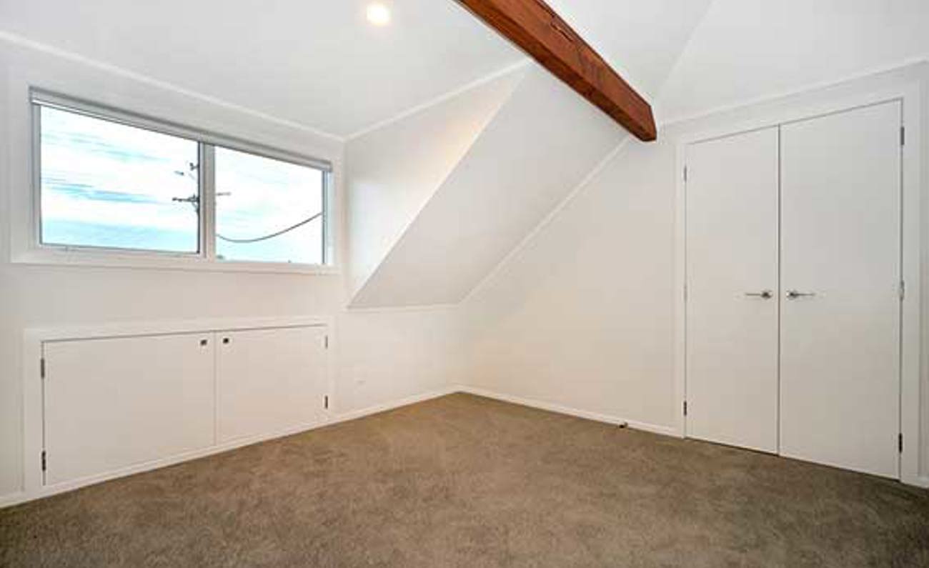 Upstairs are three large bedrooms, all of which have views either to the east or west, plus there are two bathrooms and a study/dressing room in one of the bedrooms. The fourth bedroom and a large rumpus are on the lower level, together with a third bathroom. A large west-facing covered deck on this level, too, with views over the bay to Birkenhead Point.