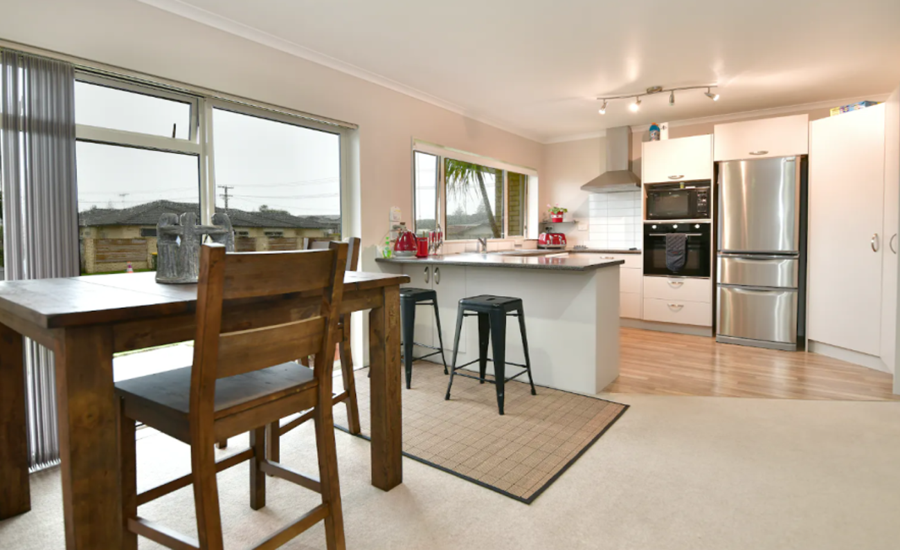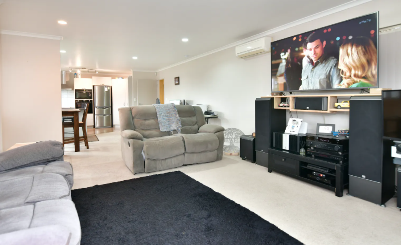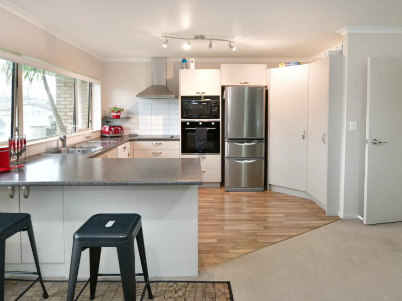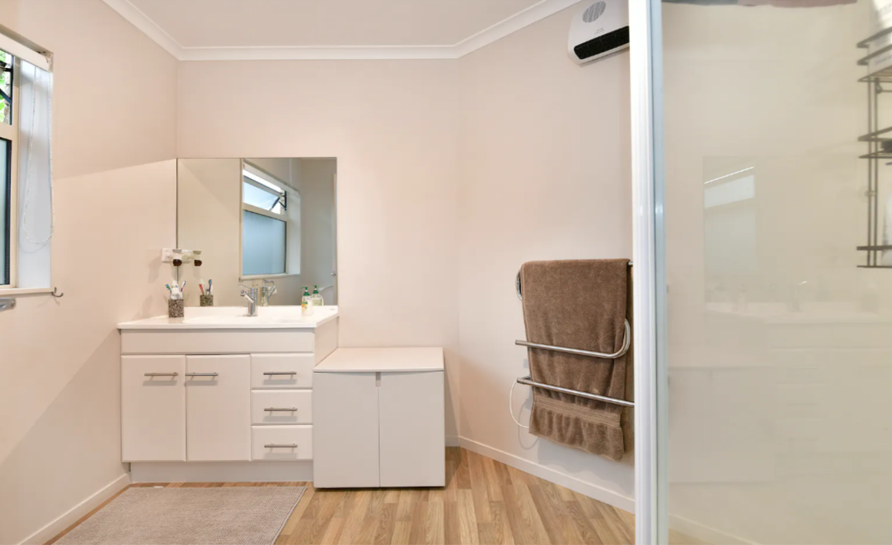 The North facing open plan kitchen, dining, and living space is decorated in neutral tones. The home is fully double glazed to keep the warmth in and noise out. A heat pump sits ready to keep you toasty on cooler days, and a ranch slider opens onto a sheltered private sun-trap.