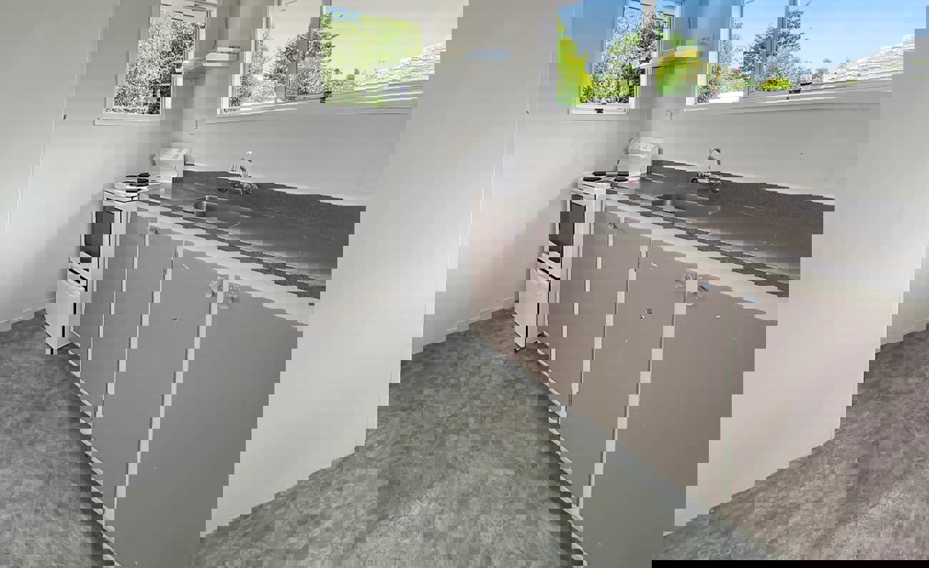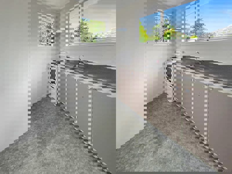 The open-plan kitchen and dining area provide ample space for everyday living, while the semi-open living room flows out onto a sunny deck with a pleasant outlook over the park—perfect for relaxing or entertaining.
