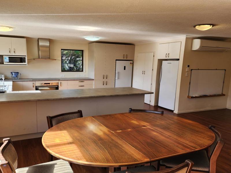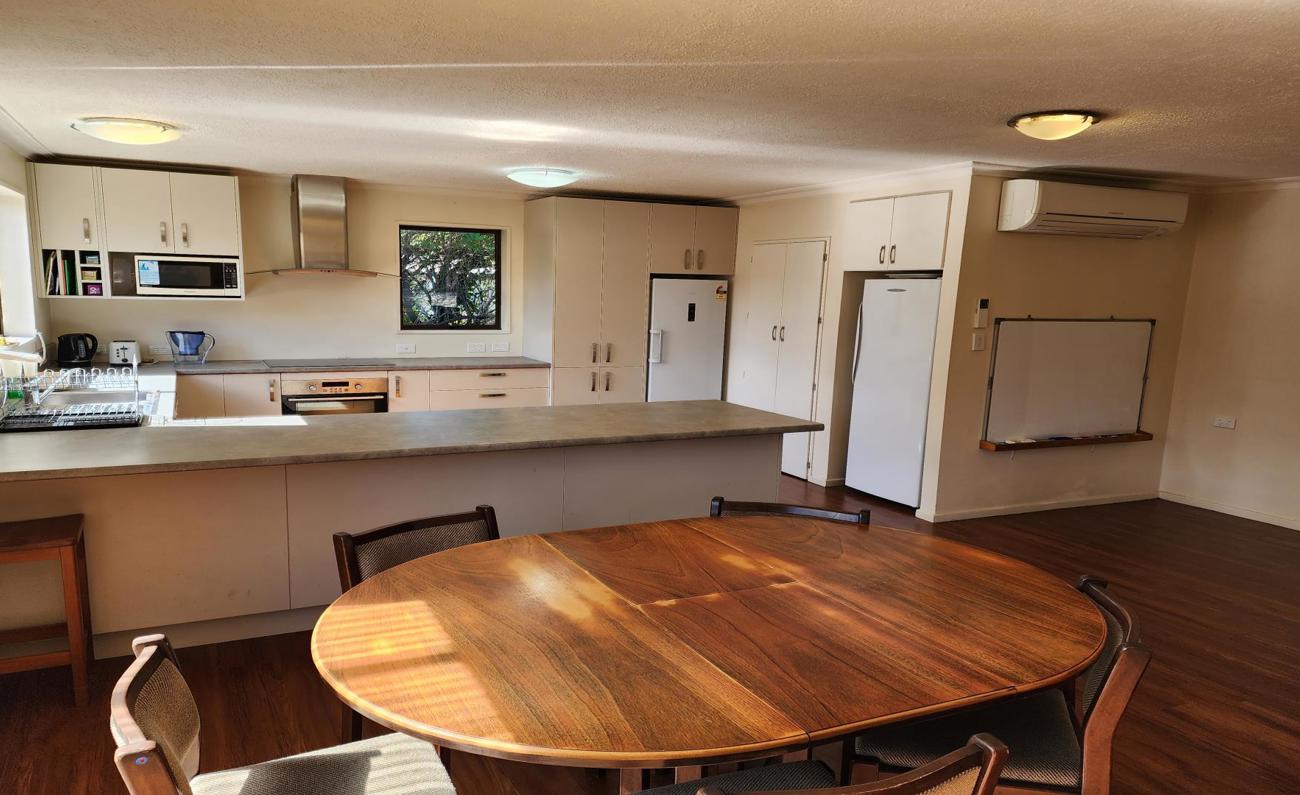 • Spacious, sunny open-plan kitchen and dining area with oven, induction cooktop, microwave, fridge, freezer, and large pantry
