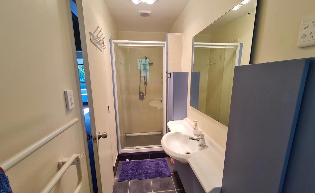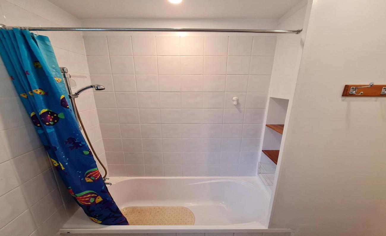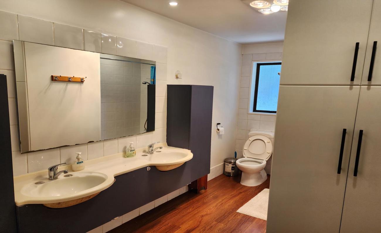 • Well-appointed family bathroom with shower-over-bath, double vanity, toilet, and ample storage