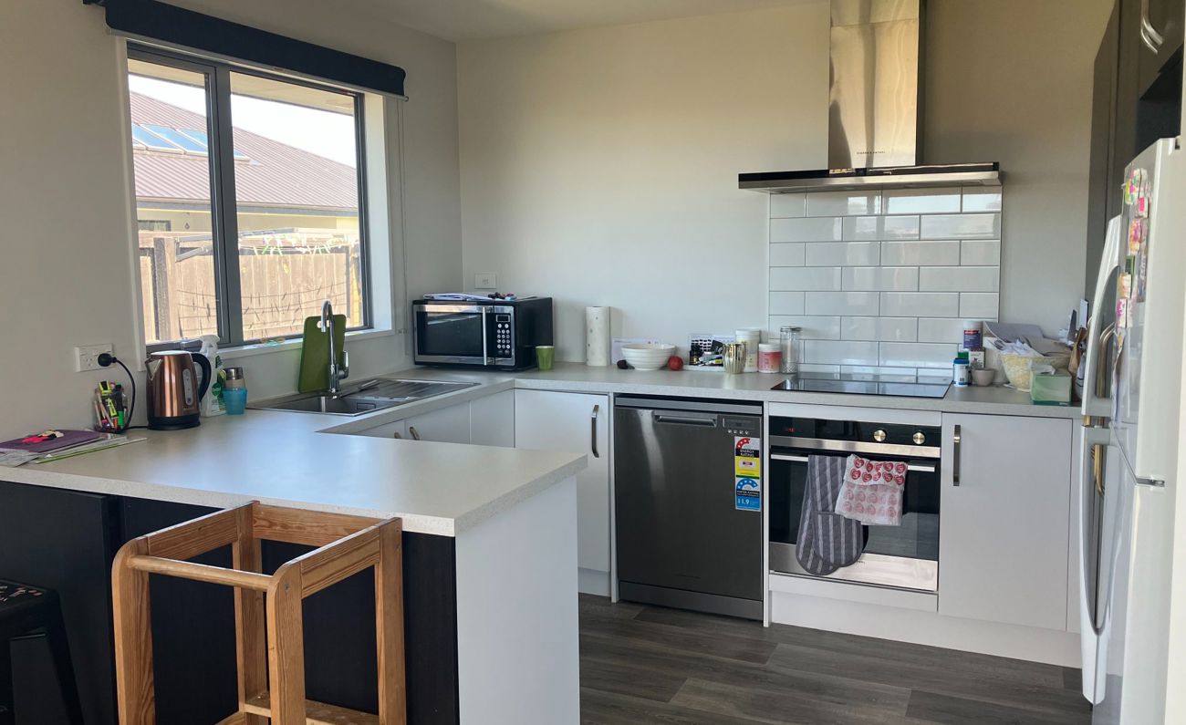 This 2-bedroom home offers a modern kitchen with an open plan for the living and dining areas and access to the private yard.