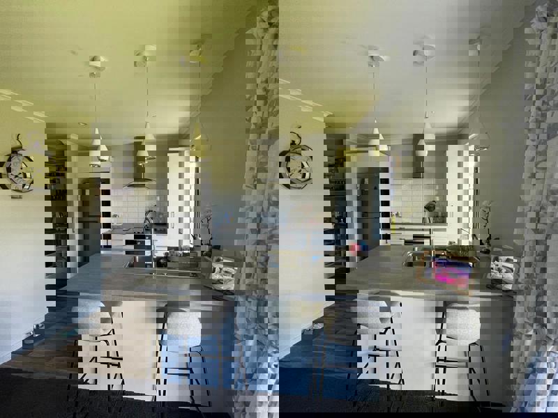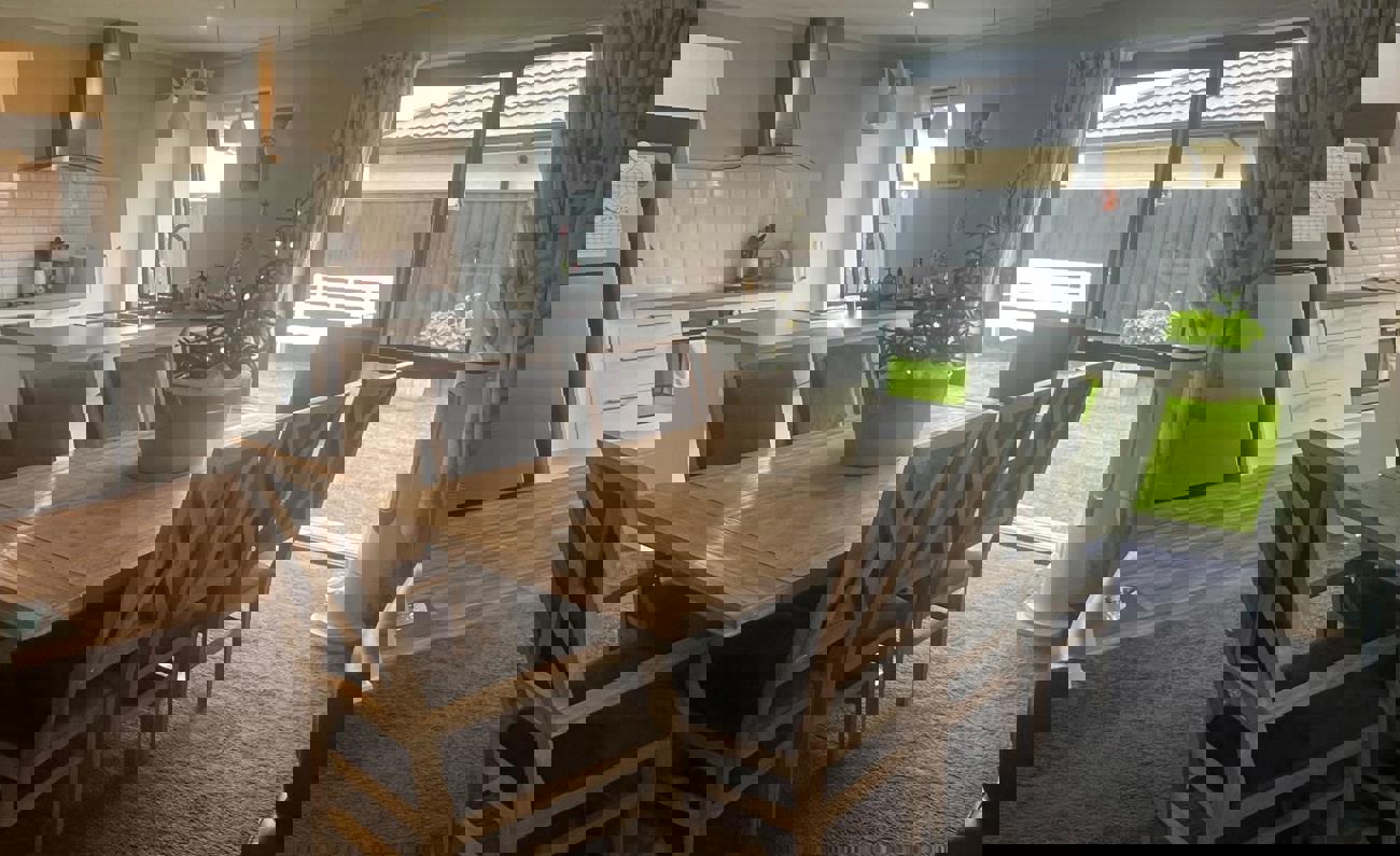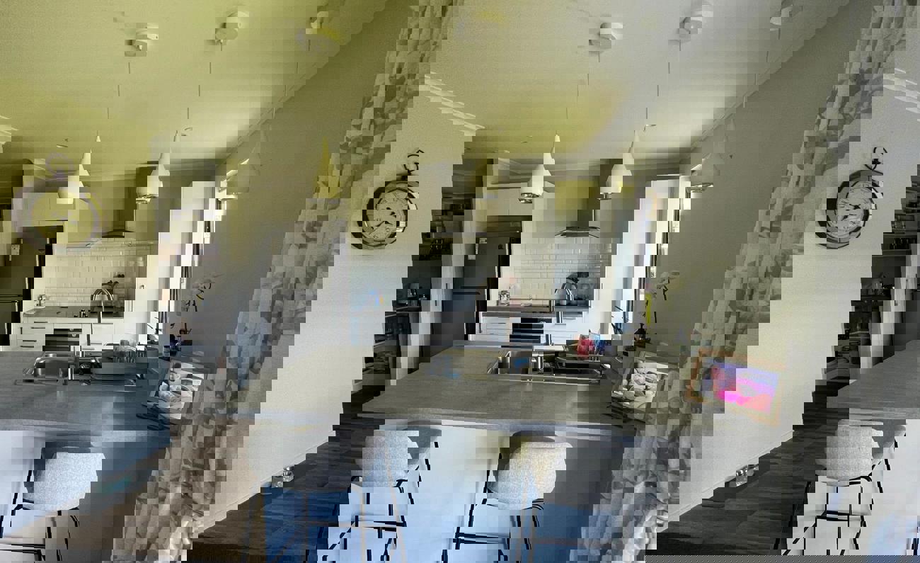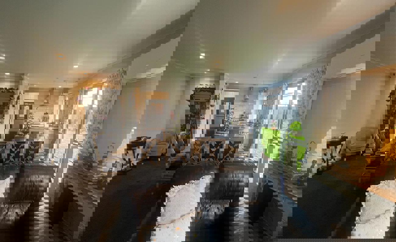 * Open-plan kitchen, dining, and living area with a large walk-in pantry
