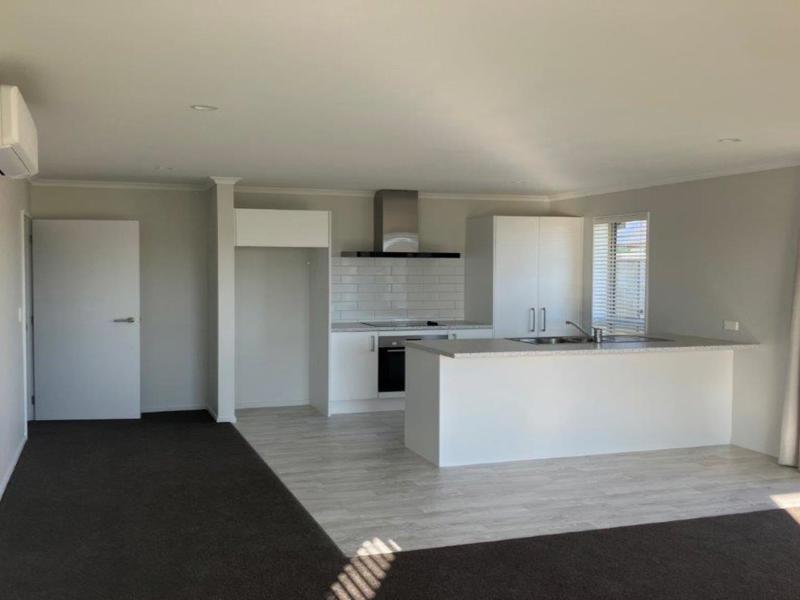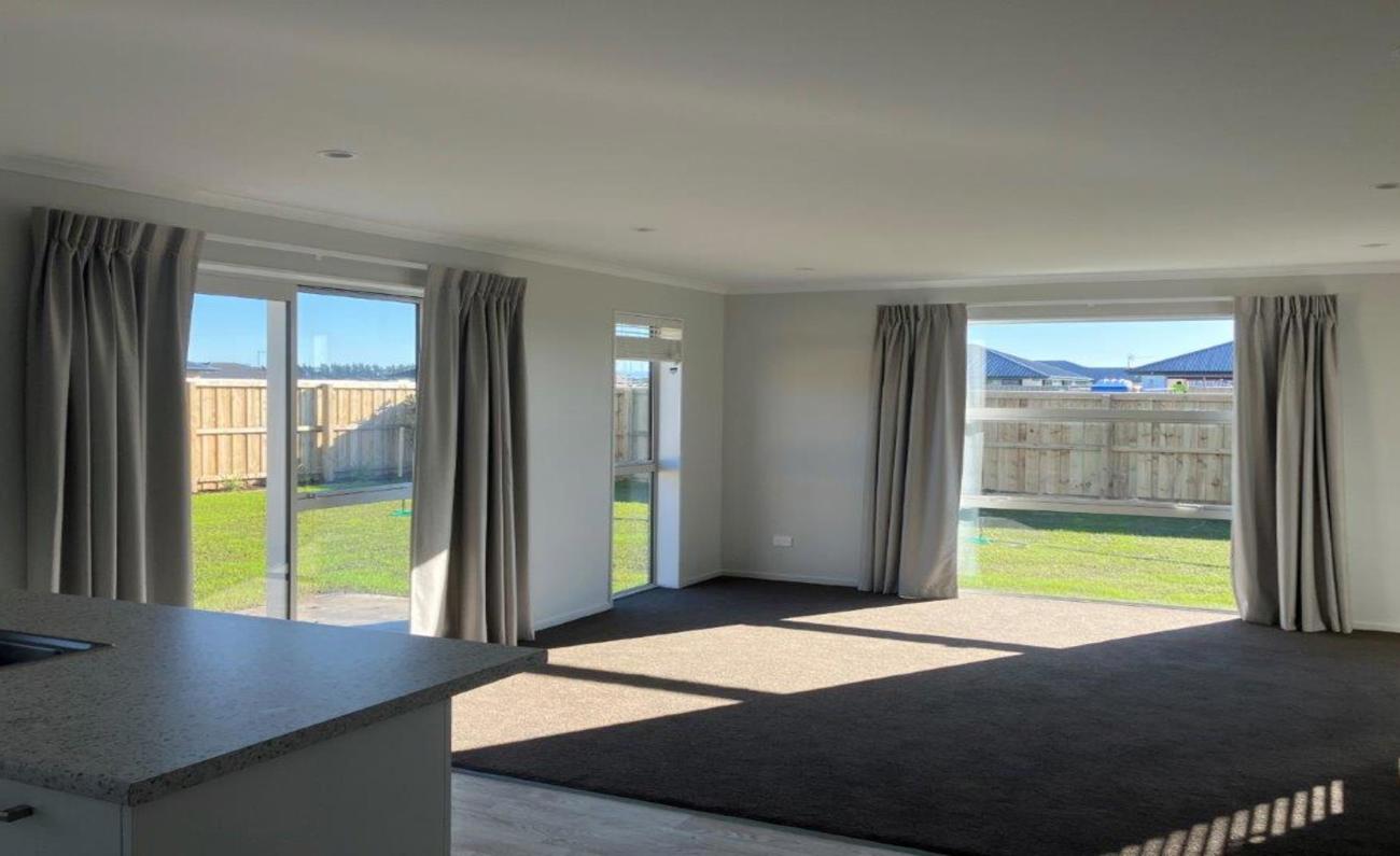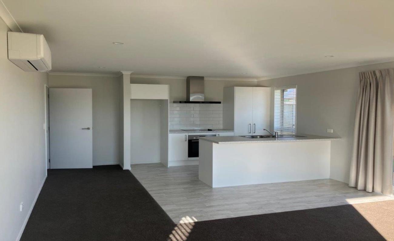 * A modern kitchen with a dishwasher and a central island making it open plan to the sunny living and dining areas.
