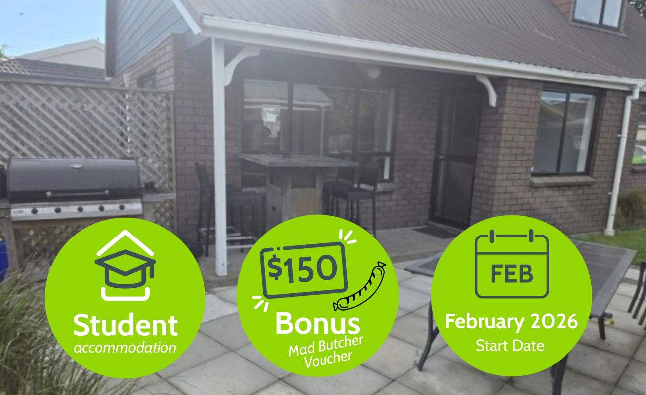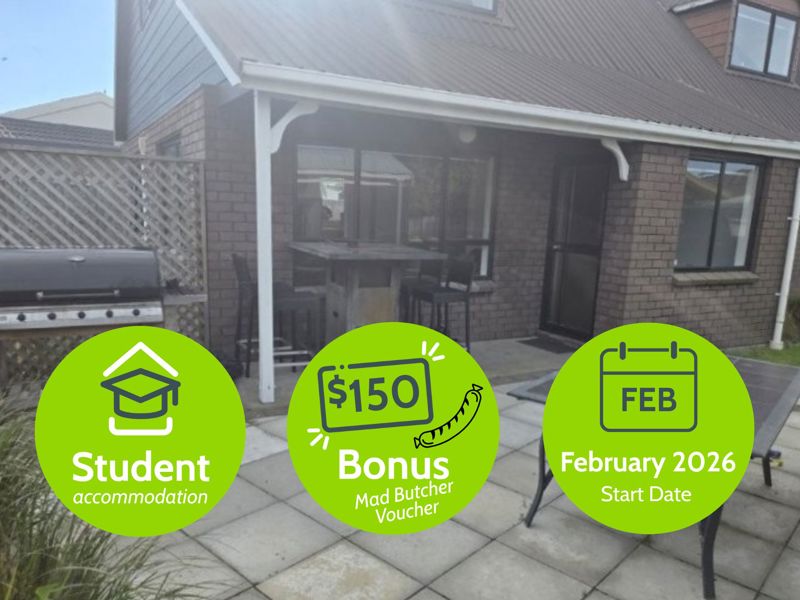 Calling on all University students still looking for accommodation for the 2026 academic year! February start, save those precious dollars for your summer activities! And hey we will even treat you to a Mad Butchers voucher worth $150 for that first summer BBQ when you move it.