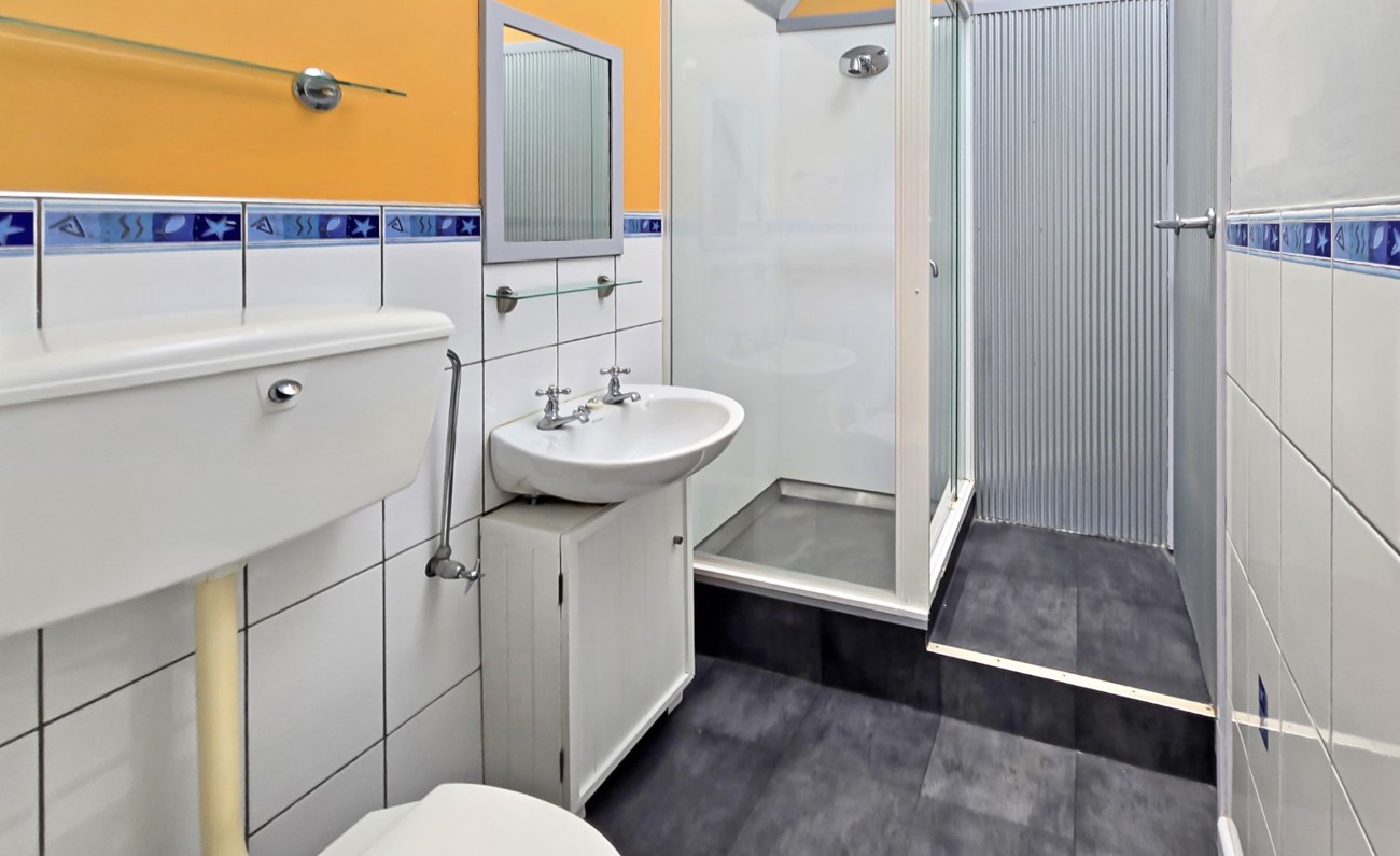 The bathroom is accessed via the laundry and features a sunny skylight window.