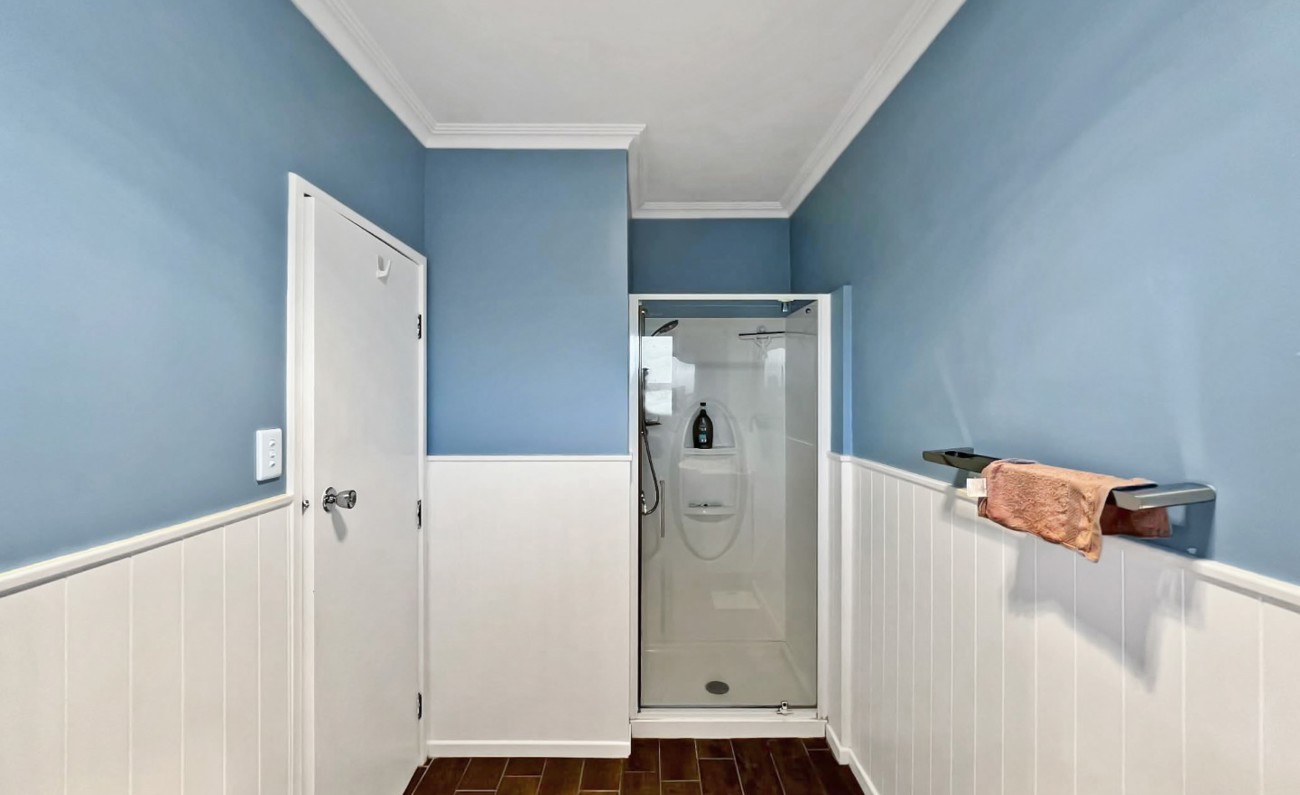 The bathroom has a shower and a bath with the convenience of a separate toilet.