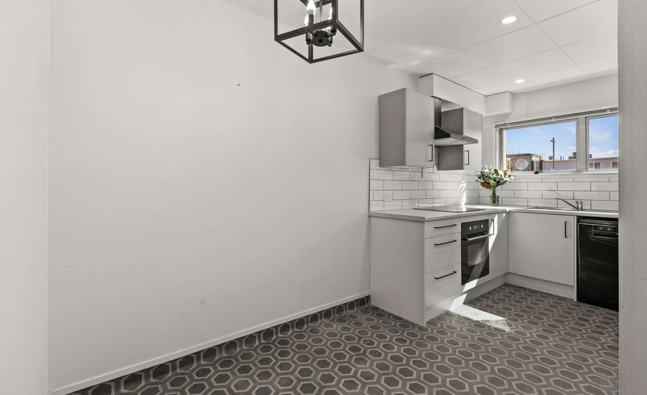 The modern kitchen comes with a dishwasher and open plan dining area for a small table and chairs.