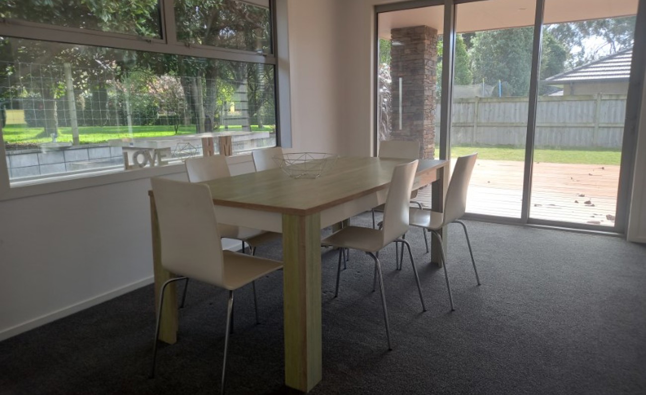The dining area flows seamlessly onto a large deck and a low-maintenance section—perfect for summer BBQs, family cricket games, or simply relaxing outdoors while keeping an eye on the children.