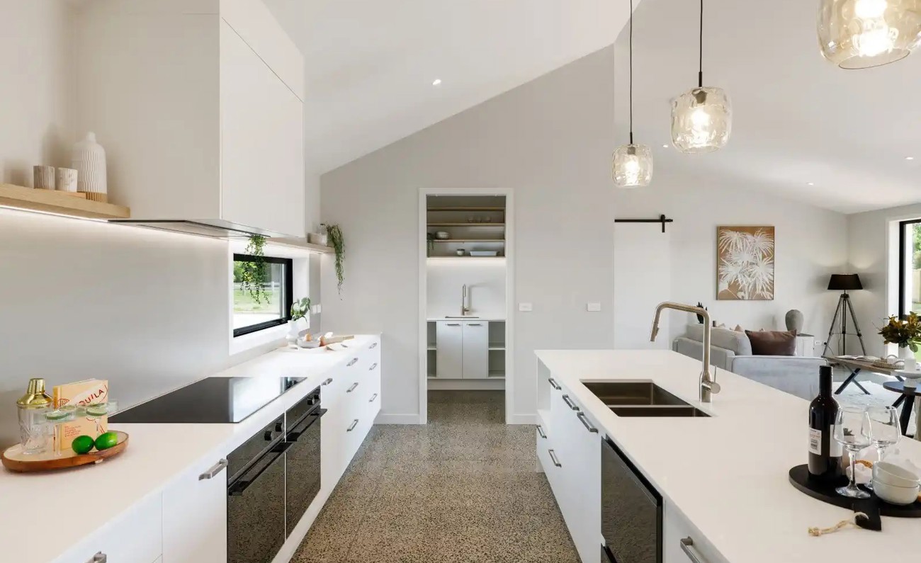 The kitchen is a real highlight — modern and spacious, with an induction cooktop, double ovens, and a large walk-in scullery . The open-plan living area features polished concrete floors, warm timber accent walls, and impressive scissor truss ceilings. There’s also a cleverly placed media room for relaxing.