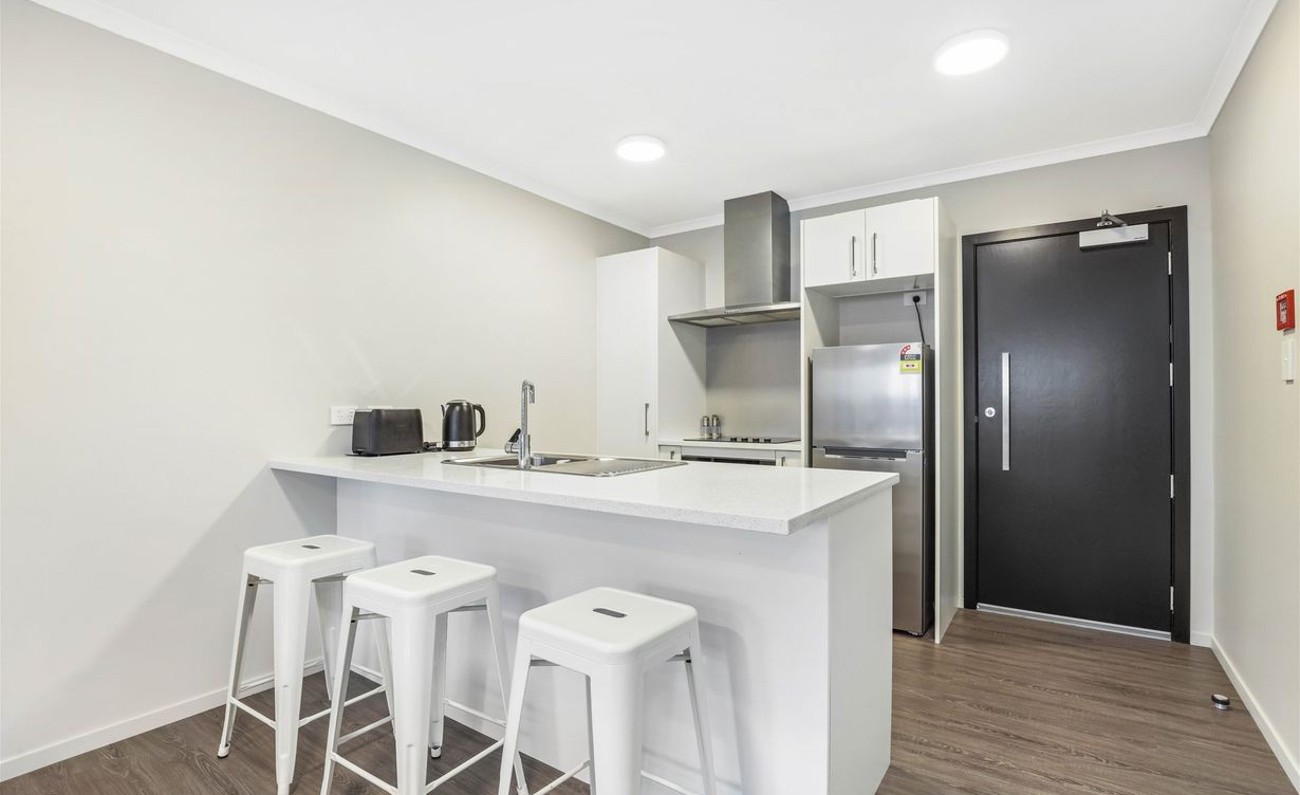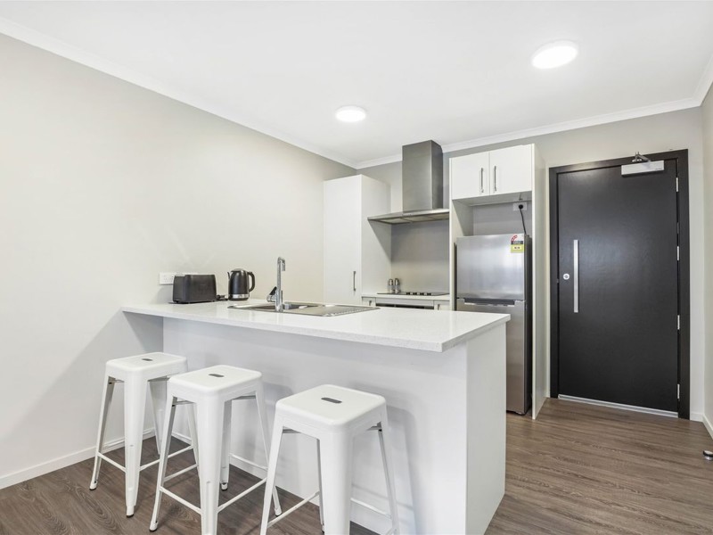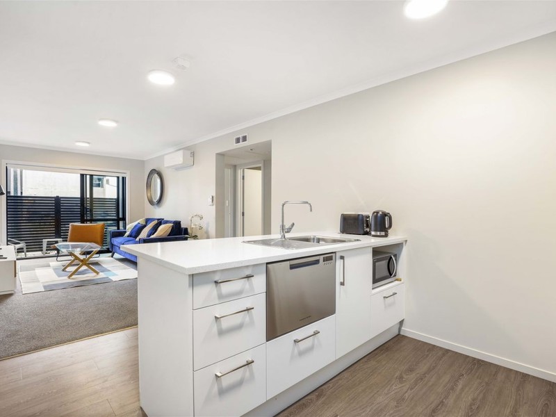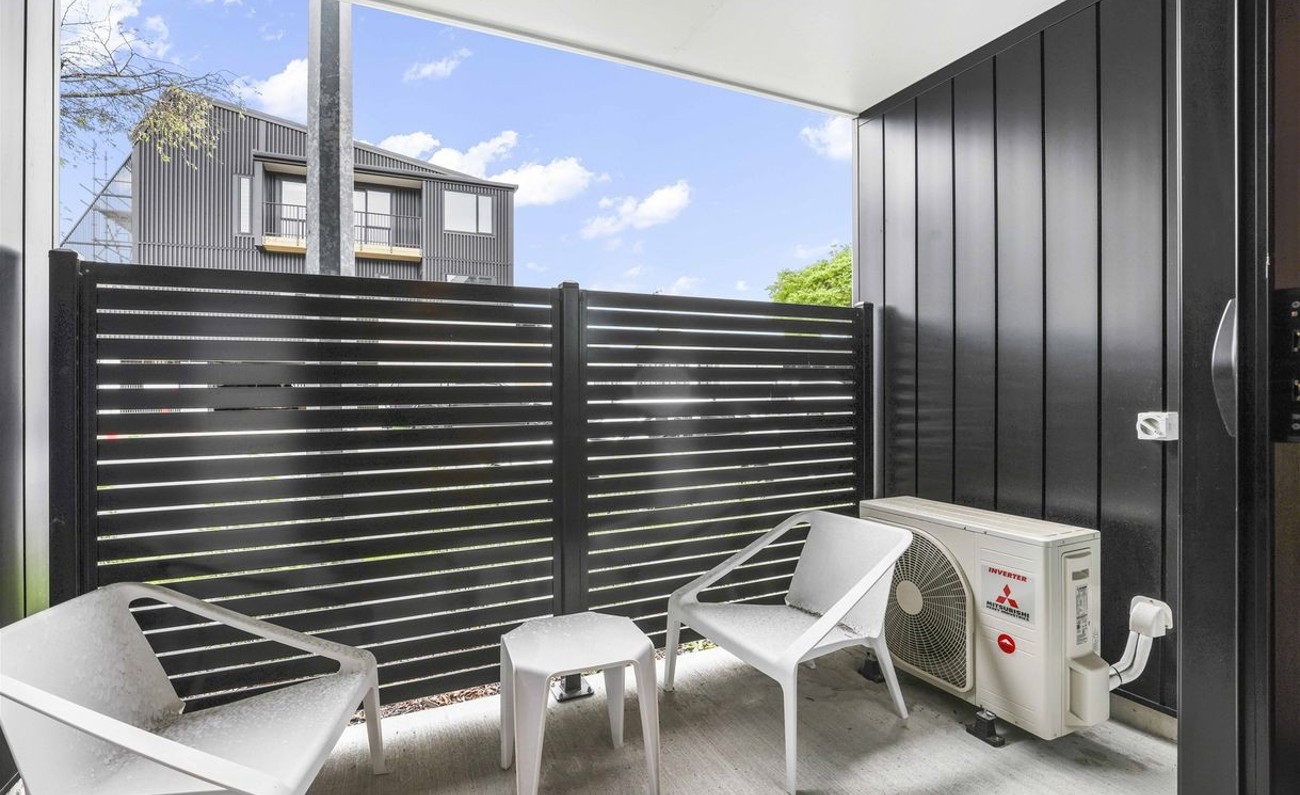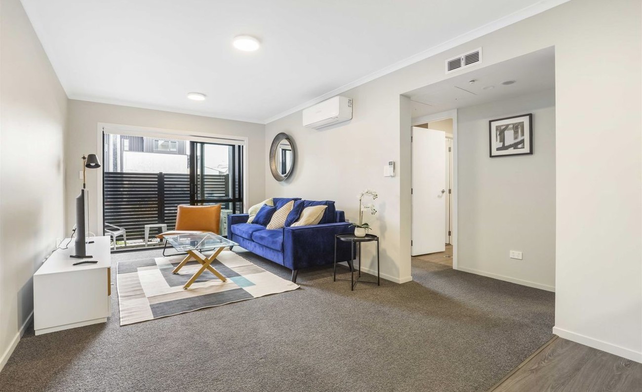 The living space opens out to a private patio—perfect for your morning coffee or unwinding after a busy day.