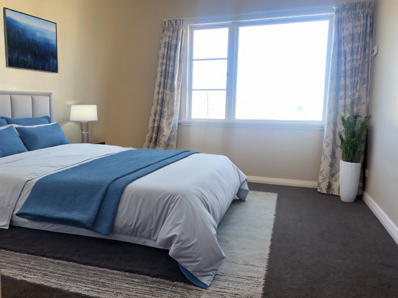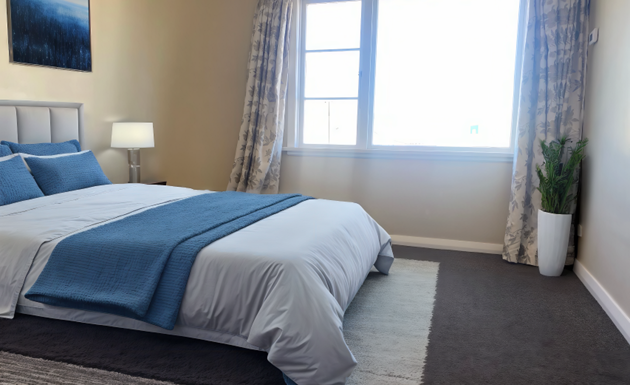 Throughout the home you’ll find neutral tones, new drapes and fittings, Art Deco light pendants, carpeted bedrooms and lounge, and wooden floors in the kitchen and bathrooms—creating a warm, cohesive feel.