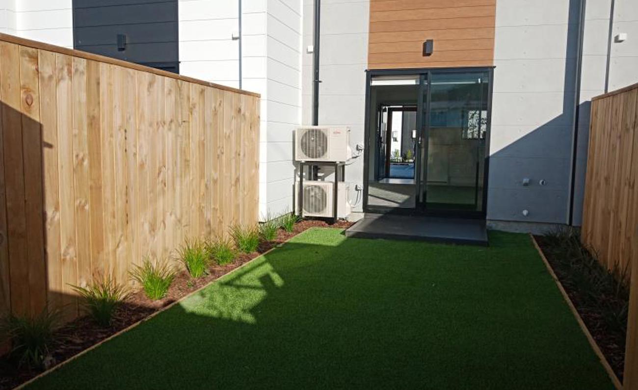 The second level includes a double bedroom with a generous wardrobe, its own bathroom, and a second heat pump.