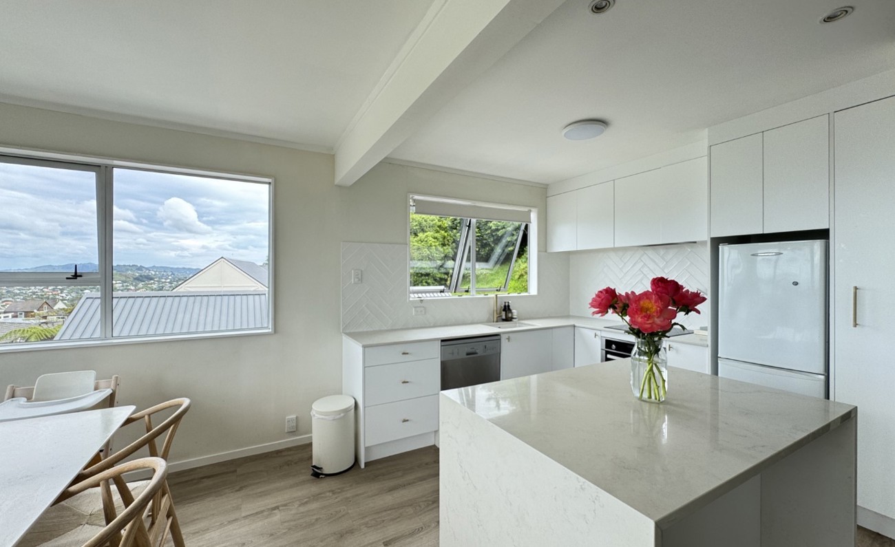 Featuring a stunning kitchen creating the perfect open plan living area surround by windows maximizing the natural light and the views of the hills and water in front.