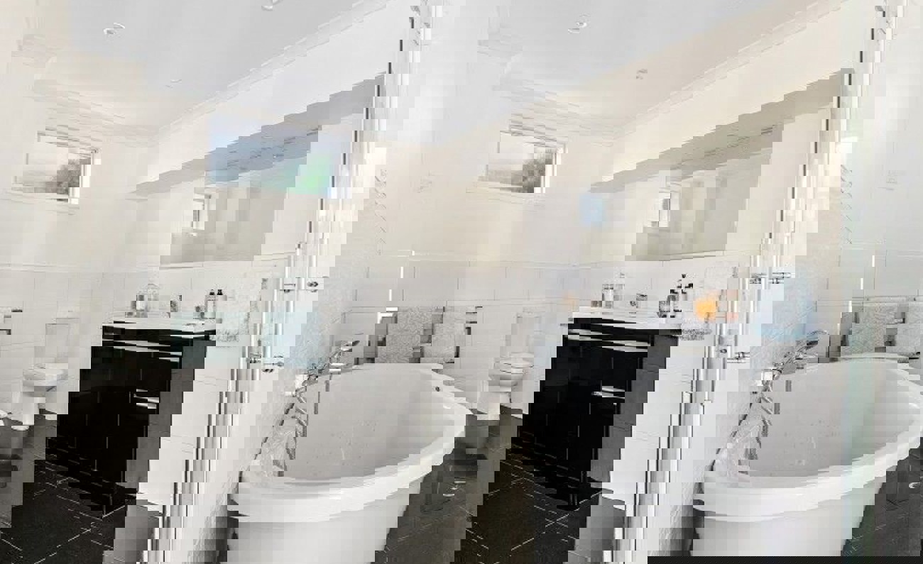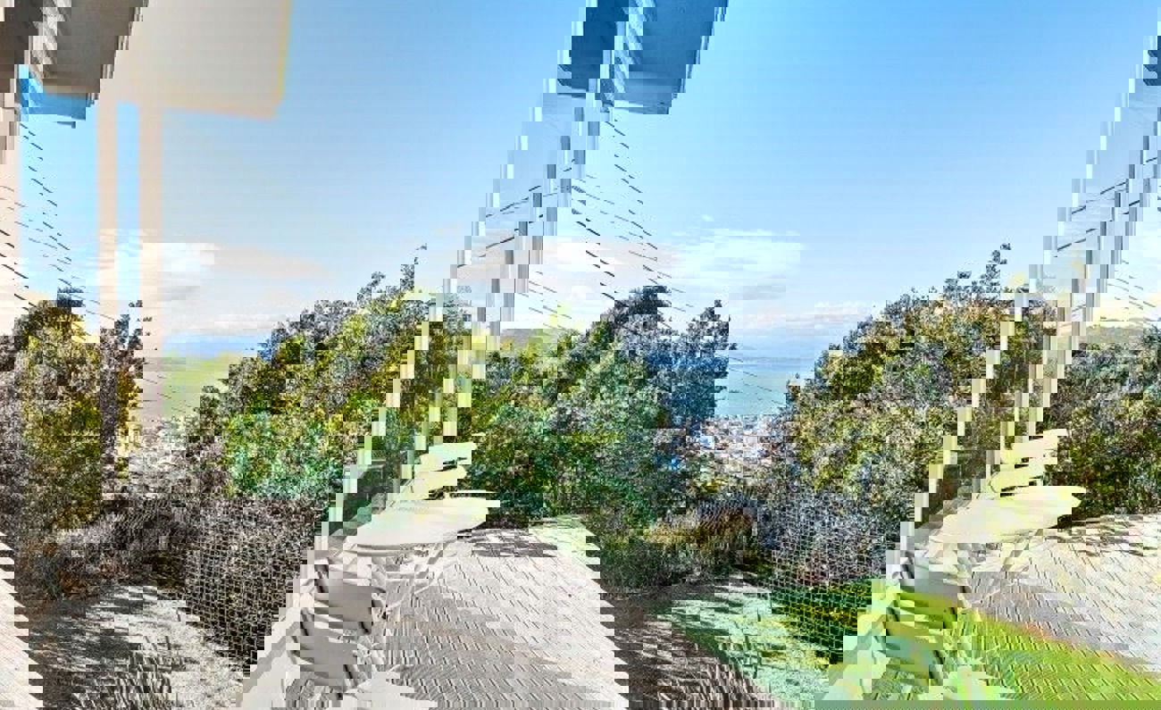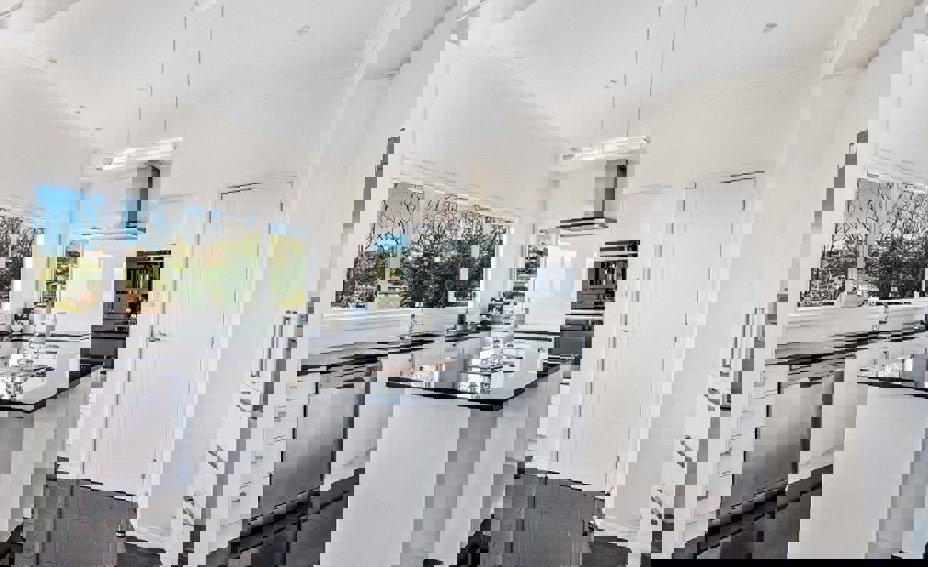 Inside, you’ll find a large formal living area with stunning views, a generous dining space that opens onto the garden, and a designer kitchen featuring a central stone island and induction cooking—ideal for entertaining.