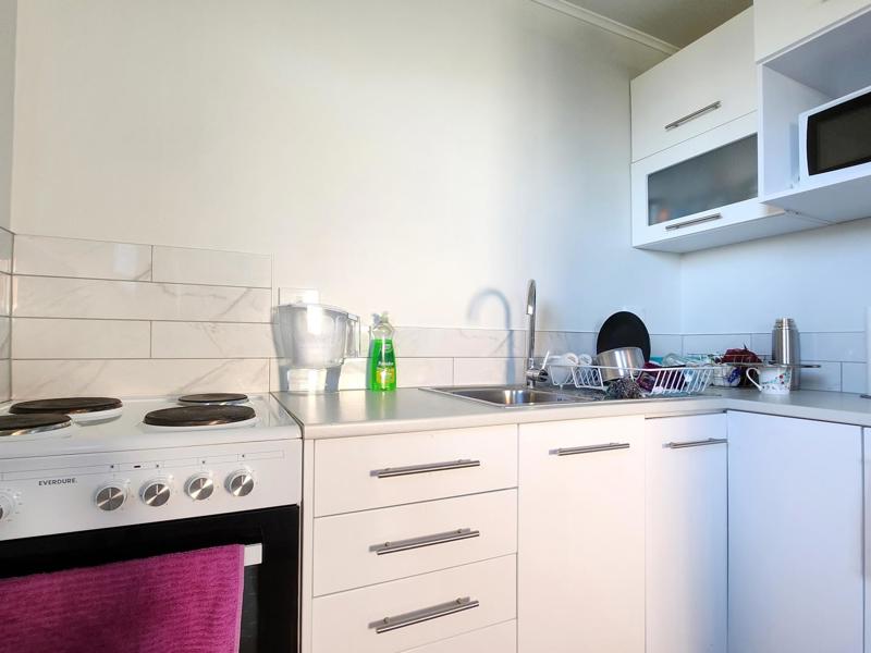 The open-plan living area captures great natural light and enjoys lovely views across the surrounding hills. The kitchen is tidy and functional, with gas included in the rent for your convenience.