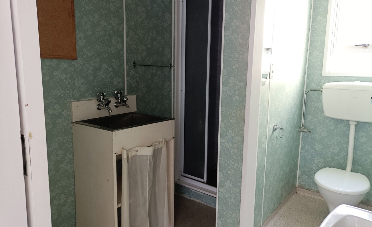 - Bathroom includes shower, toilet, vanity, and space for a washing machine.