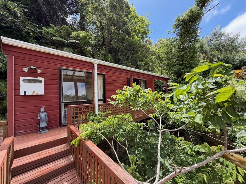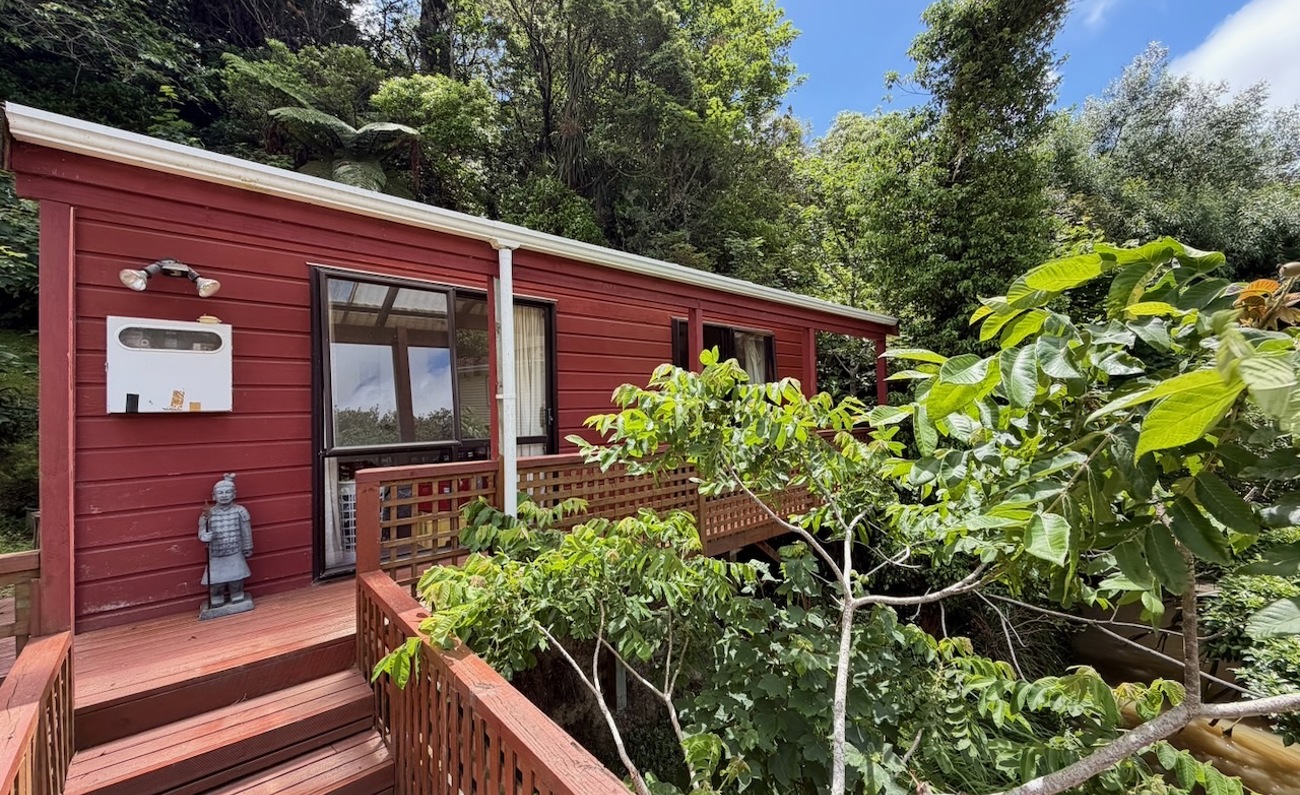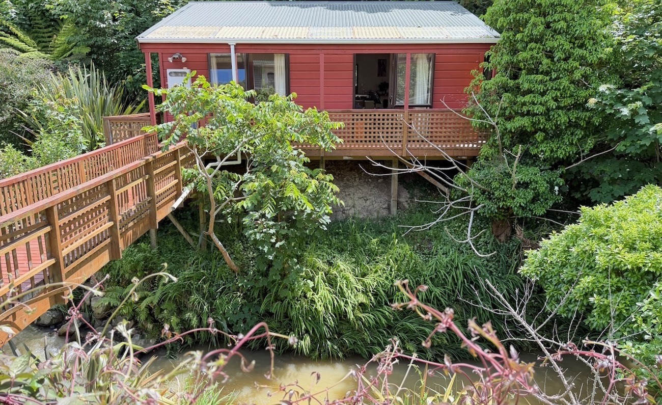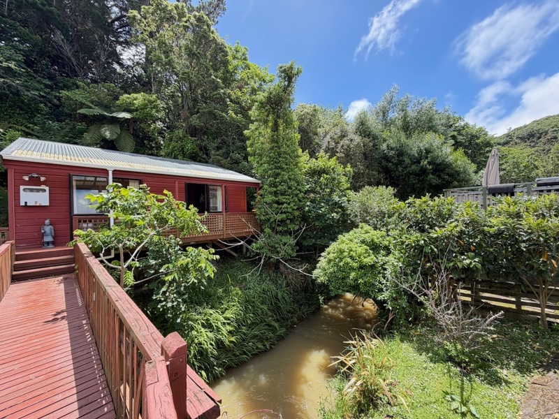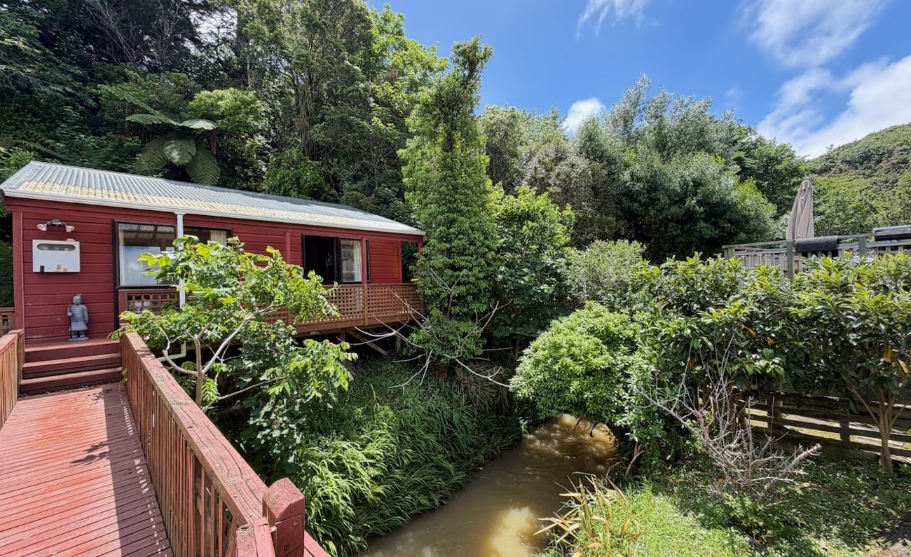 A tidy unit in a peaceful setting, featuring open-plan living and kitchen areas, one double bedroom, and a front deck overlooking the stream. The heat pump and insulation provide year-round warmth. On-street parking available.