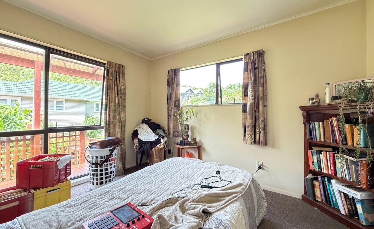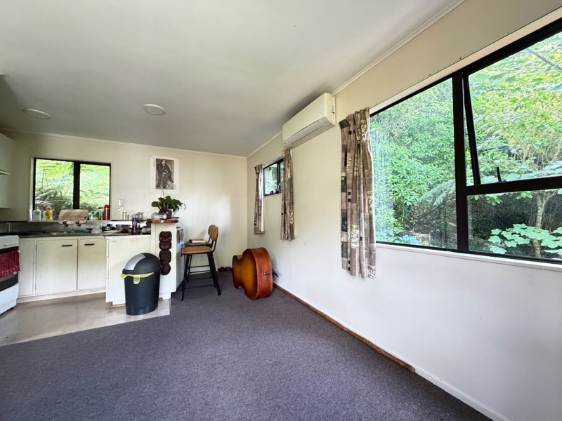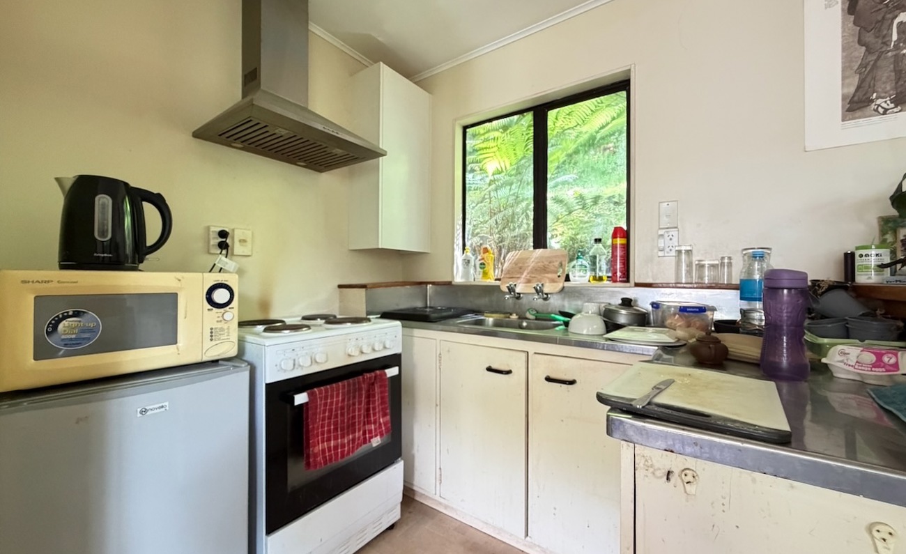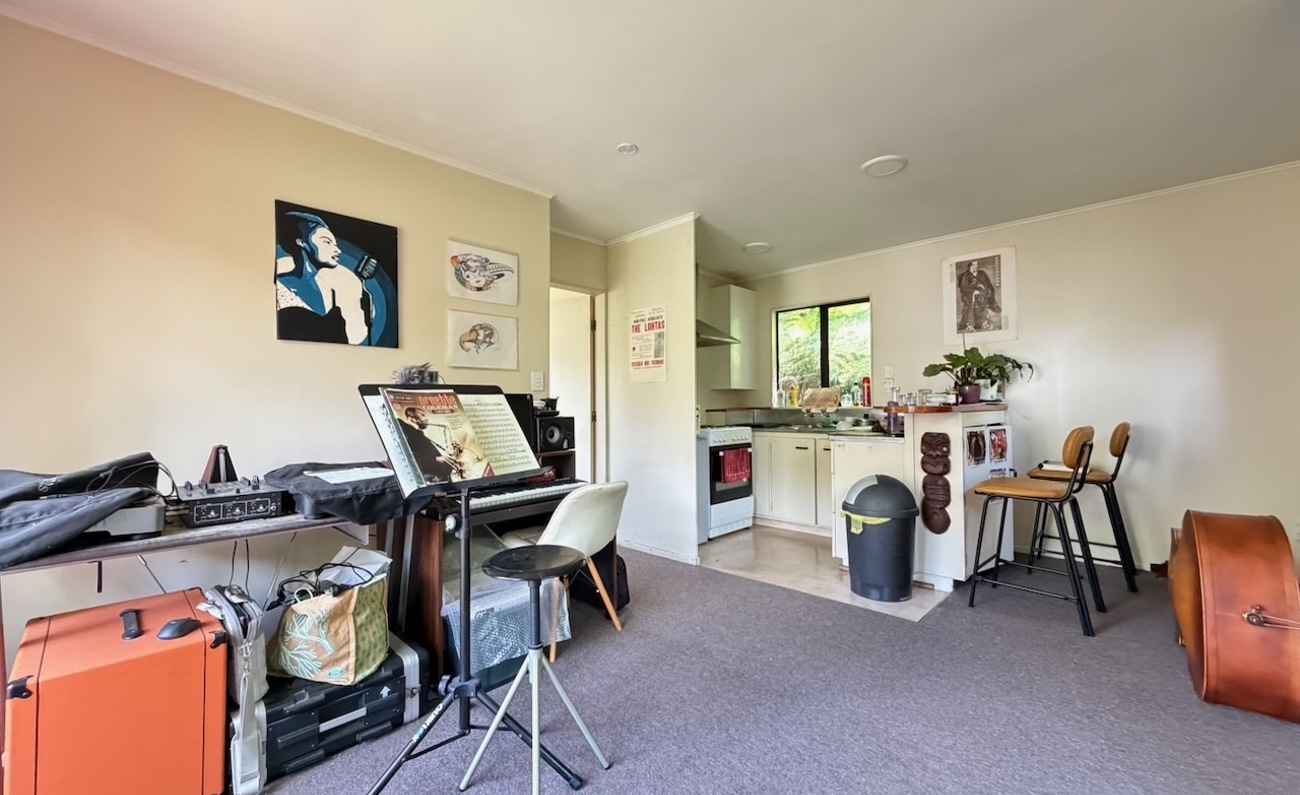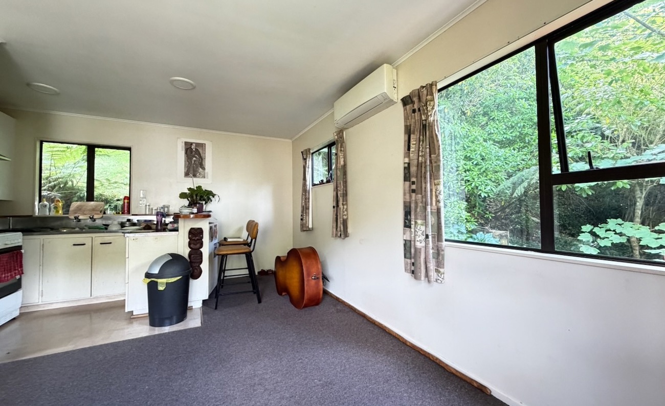 A tidy unit in a peaceful setting, featuring open-plan living and kitchen areas, one double bedroom, and a front deck overlooking the stream. The heat pump and insulation provide year-round warmth. On-street parking available.