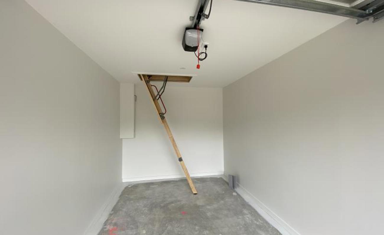 A large single garage with internal access has a loft ladder to the storage area that runs the entire length of the garage!