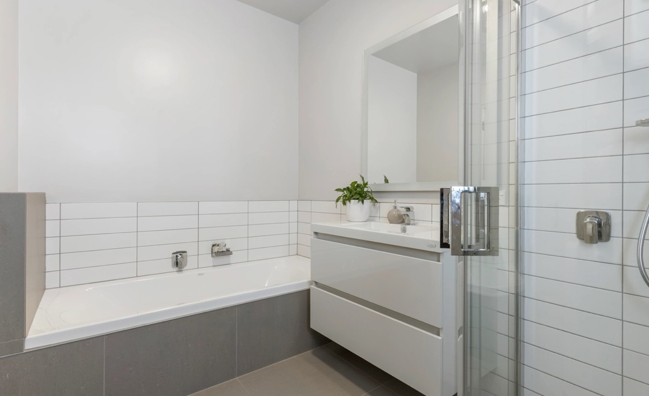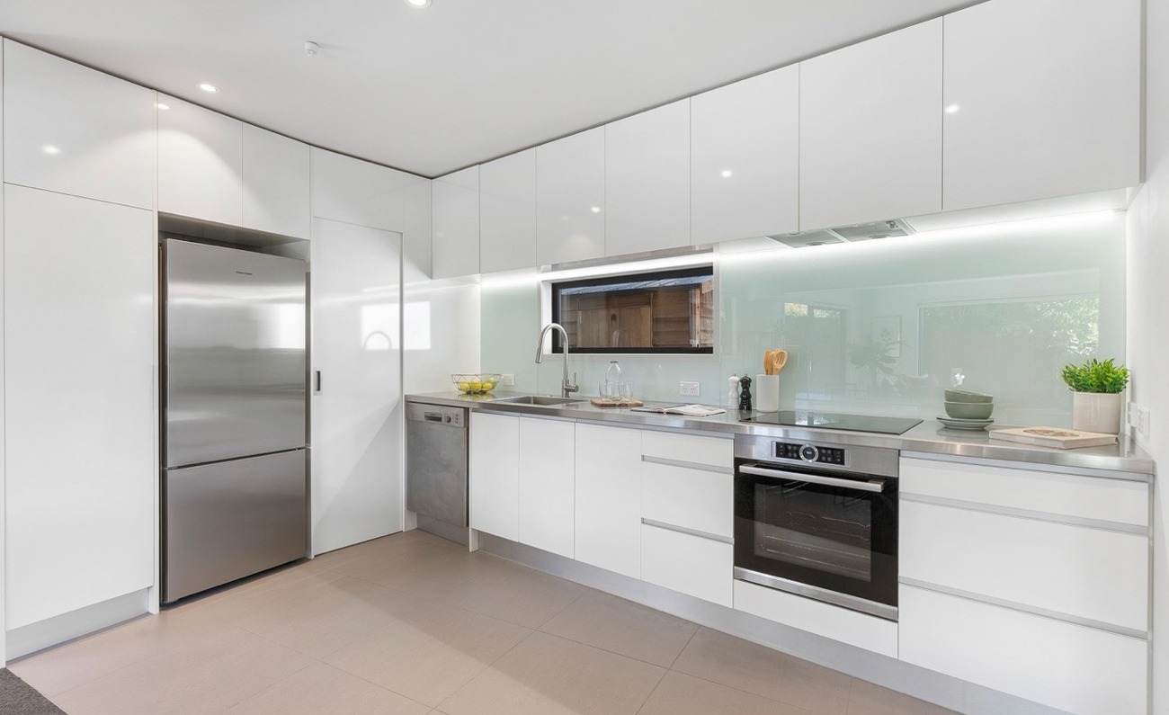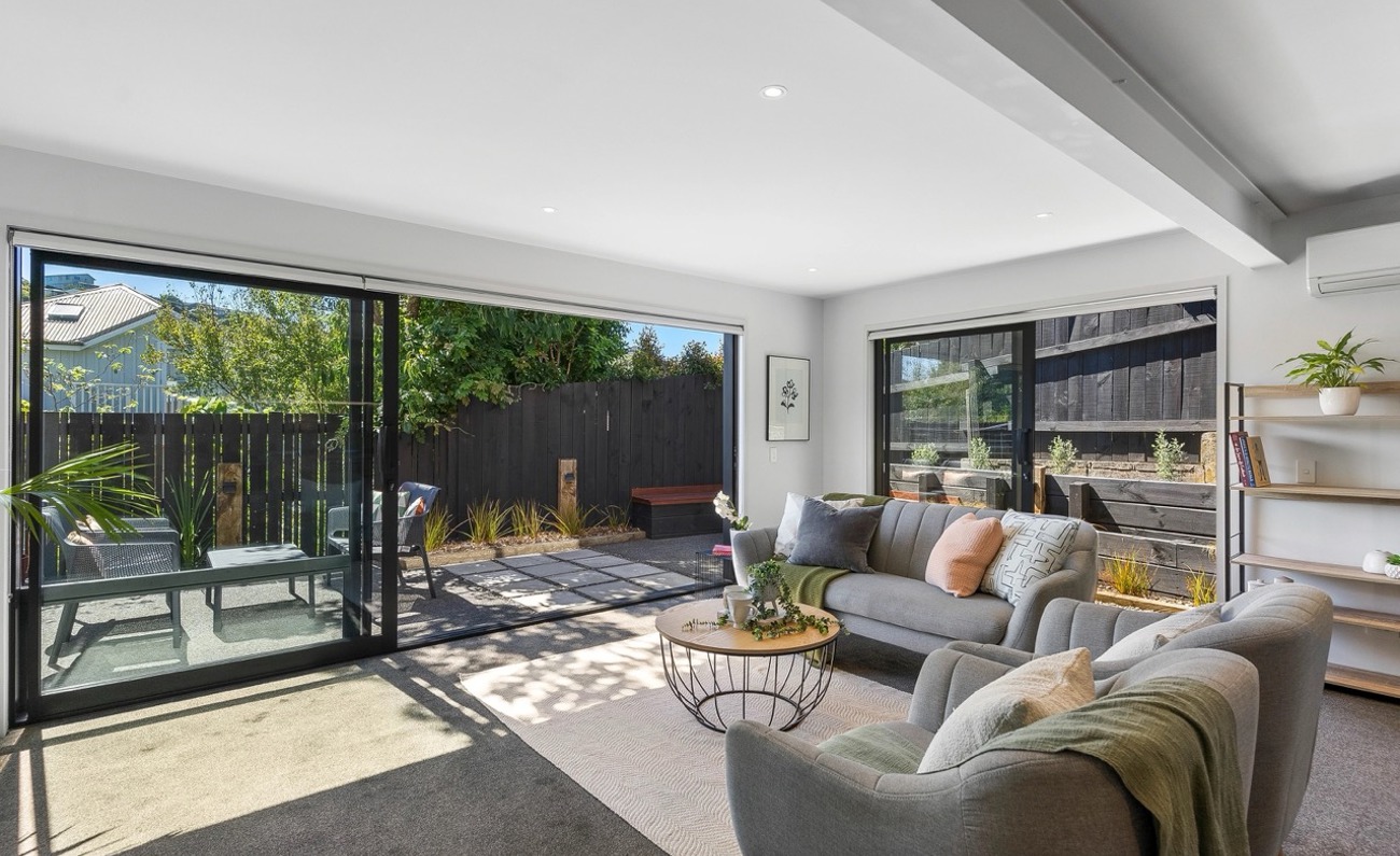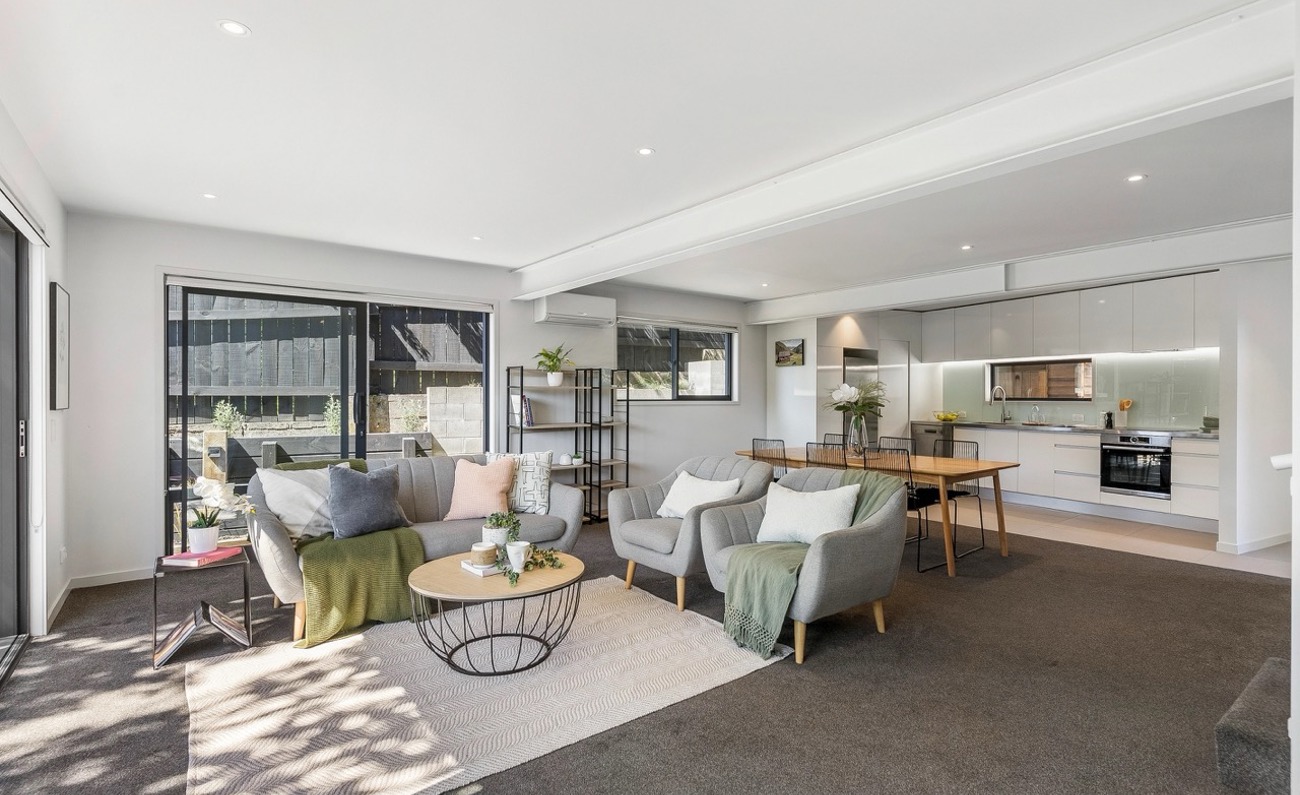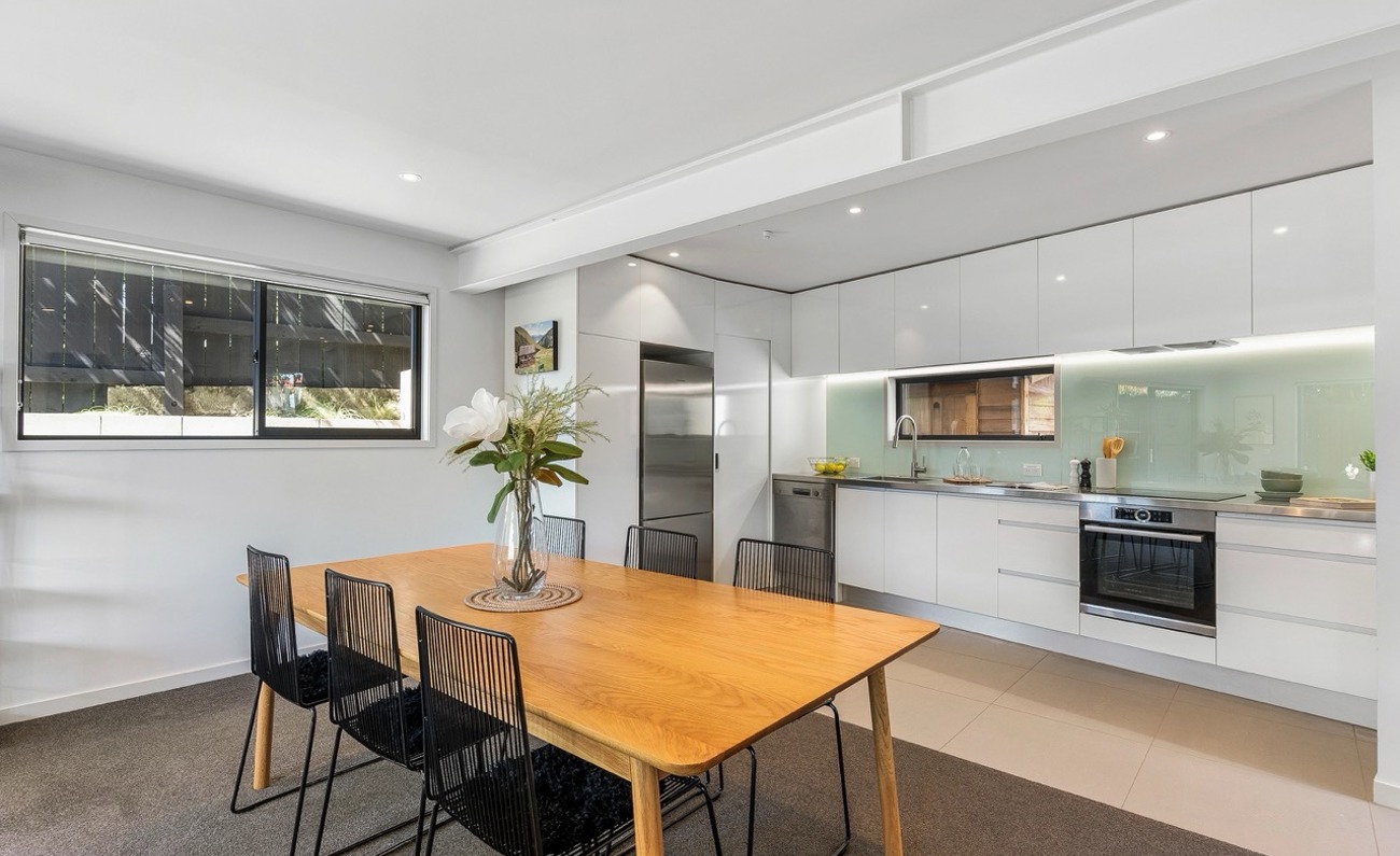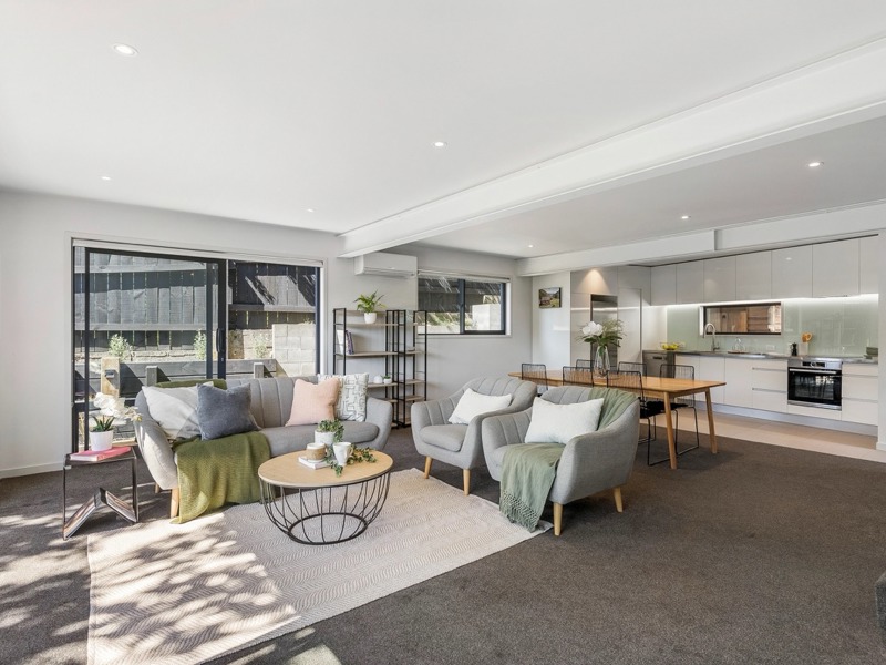 The open plan living area flows to a private, northwest facing courtyard, creating an easy indoor–outdoor space for relaxing or entertaining. A modern kitchen with an adjoining dining area makes everyday living effortless.