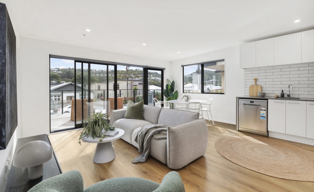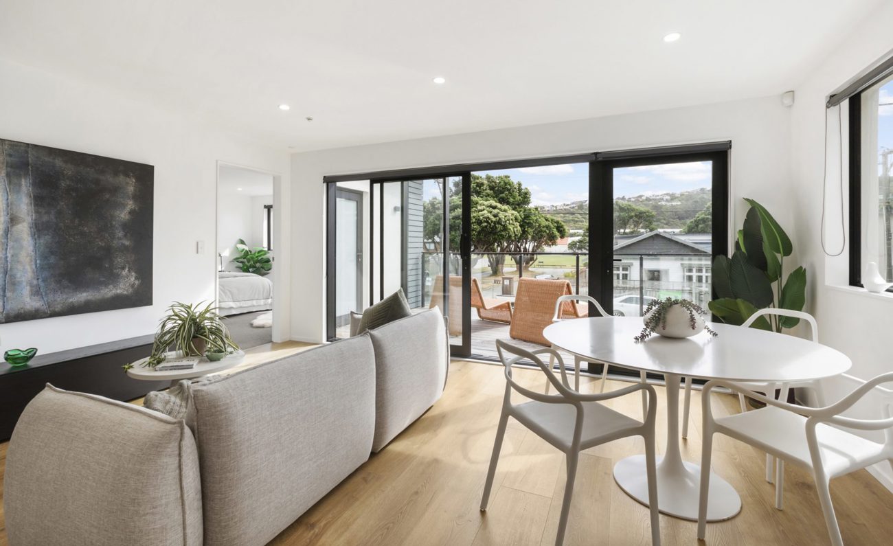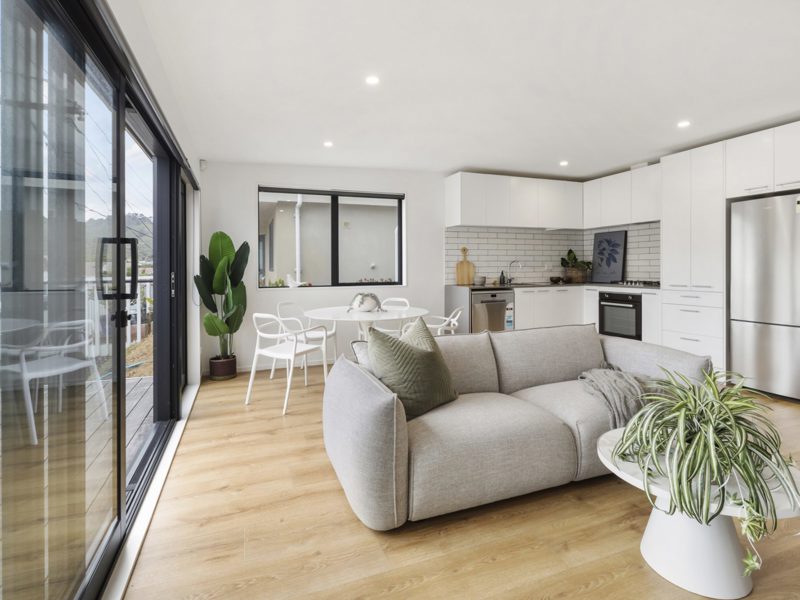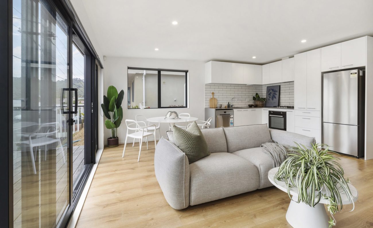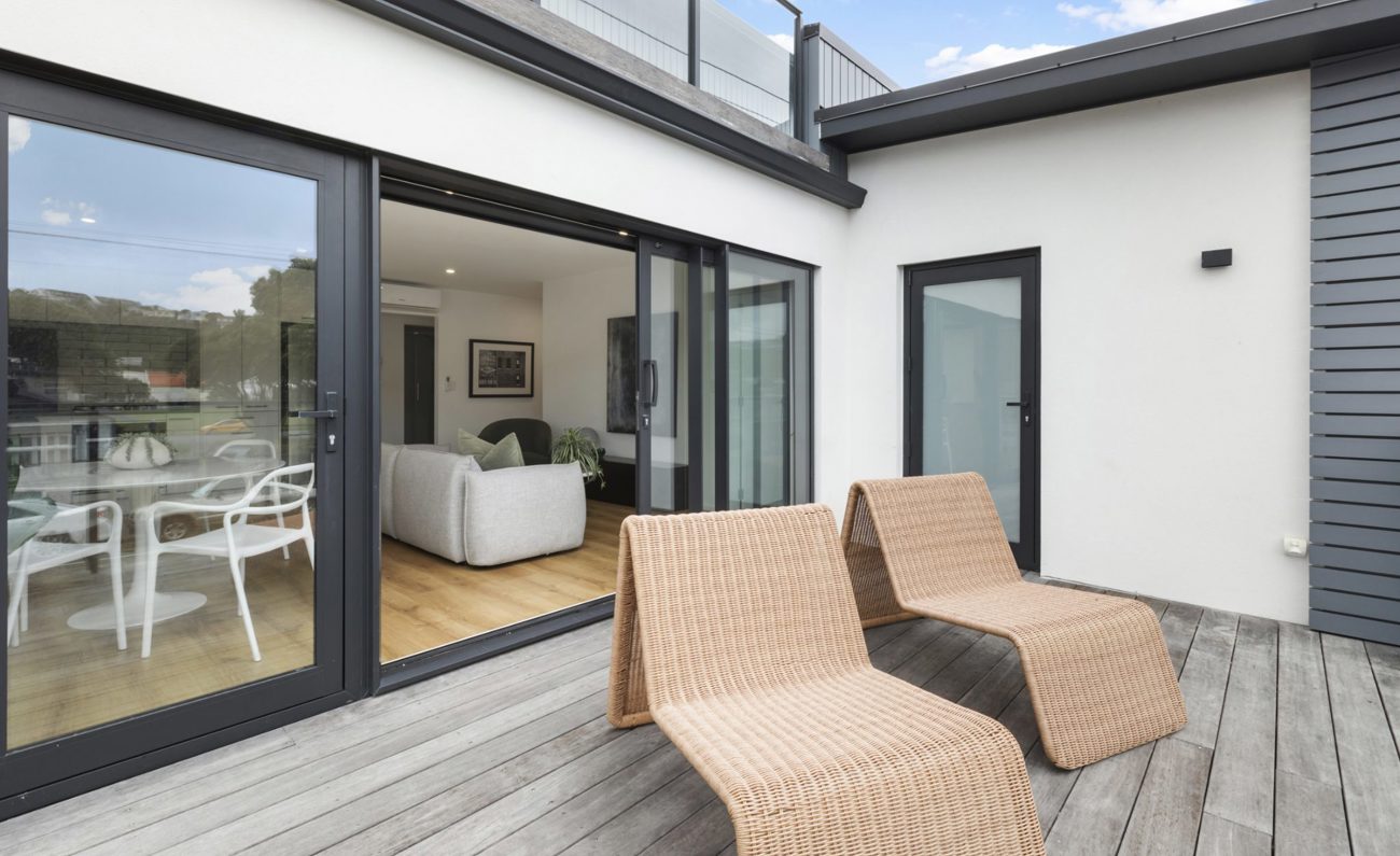 The open-plan living connects seamlessly to the deck, making the most of the home’s sunny orientation and creating a space designed for effortless day-to-day living.