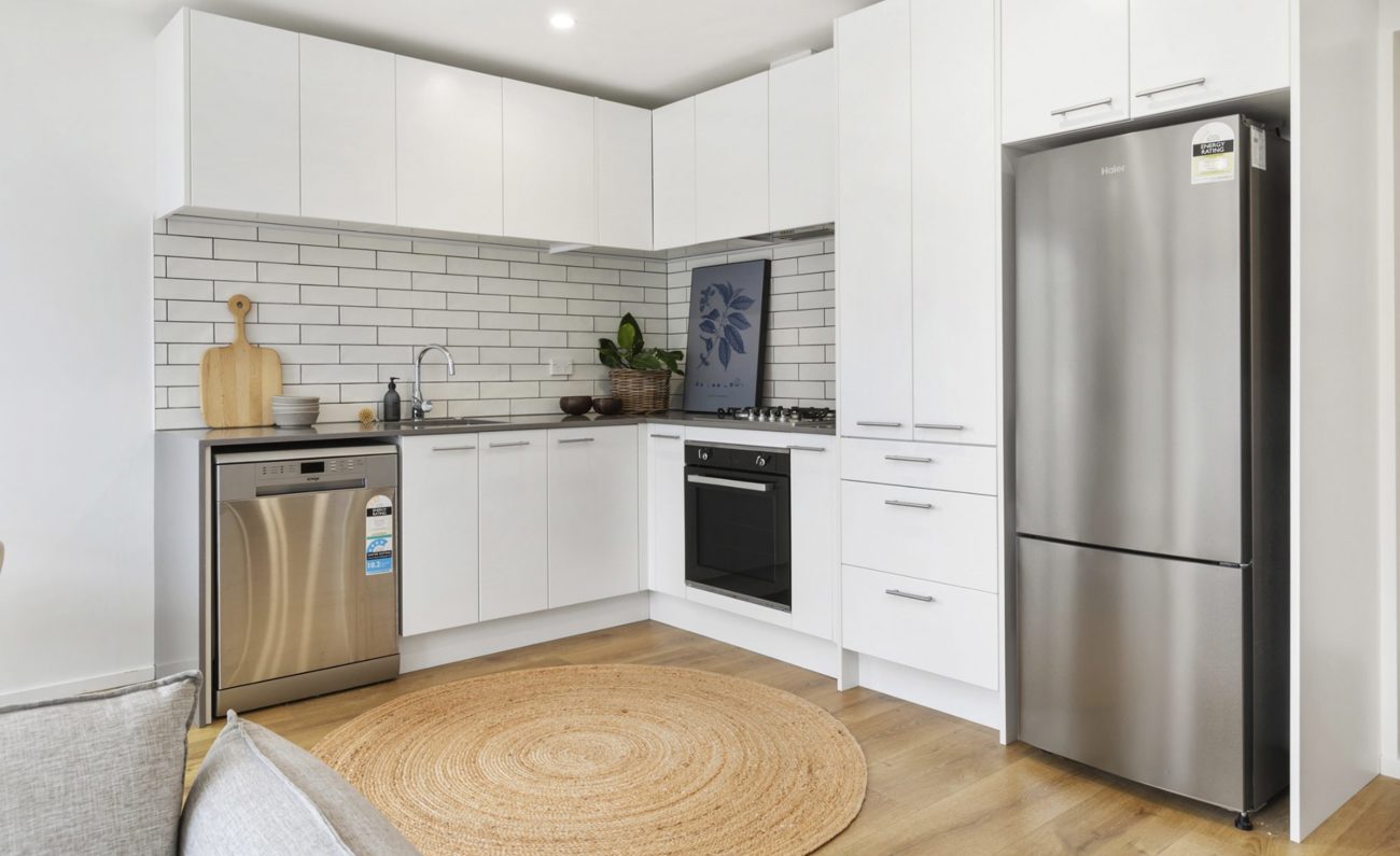 The modern kitchen features an engineered stone benchtop, tiled splashback, and LED lighting, and comes complete with a fridge, microwave, washing machine, and dryer for your convenience.
