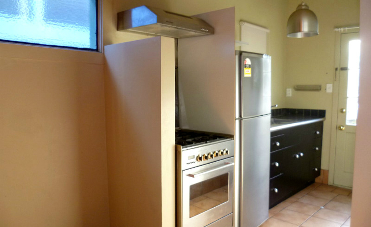 The galley style kitchen with stainless steel fixtures opens out to a rear courtyard to enjoy some outdoor living with an easy care garden.