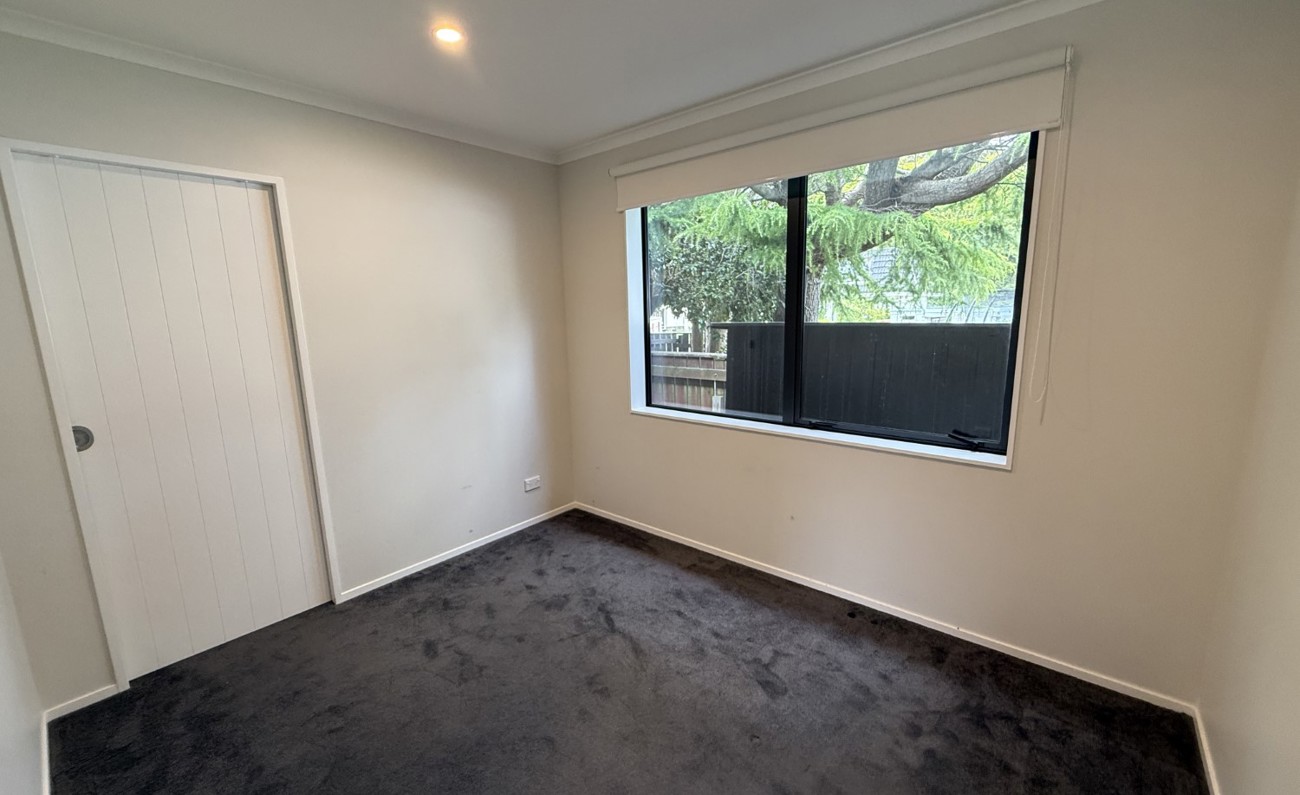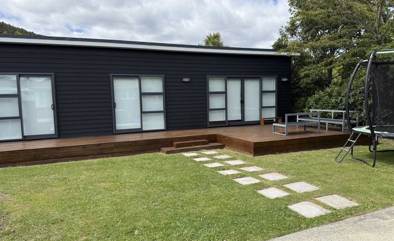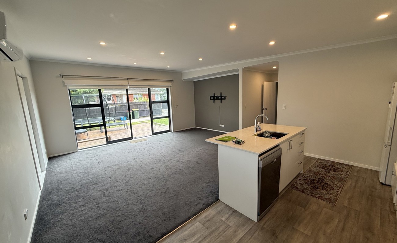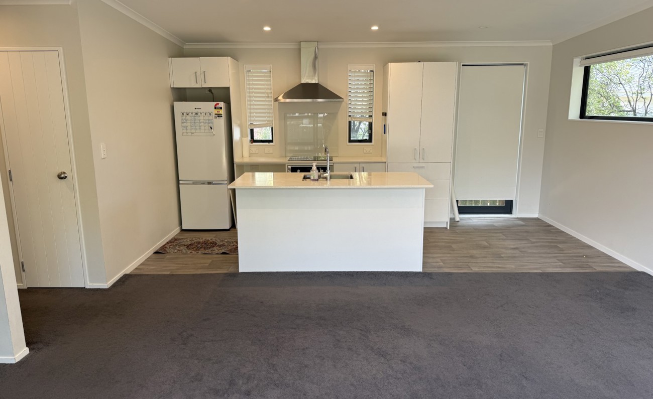 The open-plan kitchen flows seamlessly into the sunny living area, kept comfortable year-round with a heat pump. Sliding doors open to a private courtyard — ideal for relaxing or entertaining guests.